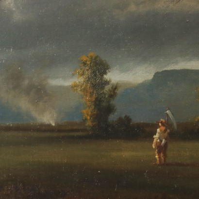 Olio su tela. Sigla e data in basso a destra. Sul sentiero in mezzo alla campagna, una famiglia di viandanti con le loro cavalcature, sostano al riparo delle fronde di un albero. Sotto un cielo bigio, in lontananza, si alza il fumo di un fuoco in mezzo ai campi, che un altro contadino osserva. L'opera è presentata in cornice in stile.