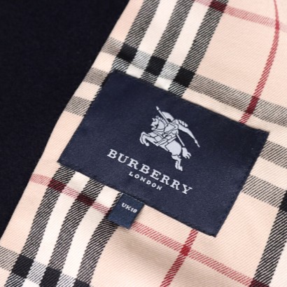 Cappotto scampanato realizzato da Burberry in pura lana vergine blu. E' dotato di un ampio cappuccio staccabile e uno spacco posteriore. Completamente foderato in viscosa con l'iconico pattern che contraddistingue il marchio. In ottime condizioni, è una taglia inglese 18 che corrisponde alla taglia italiana 50. Misura 94 cm di altezza (misura presa dalla base del collo).