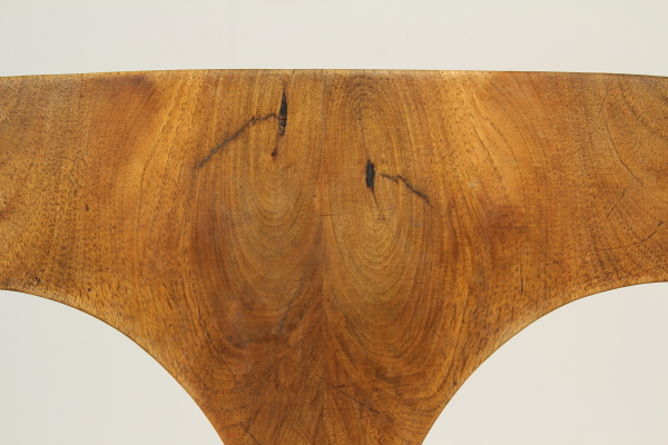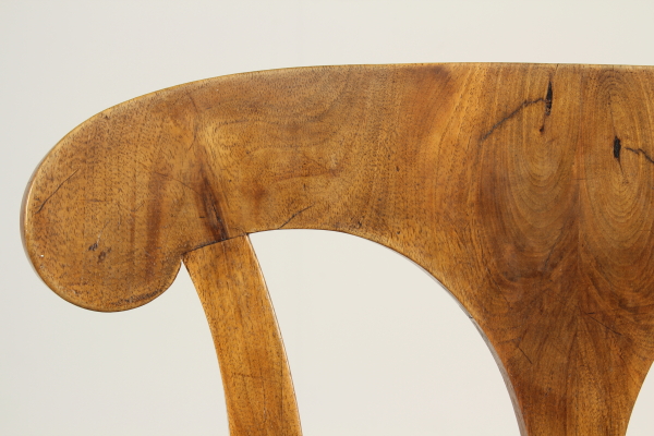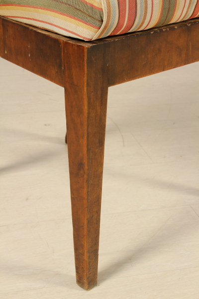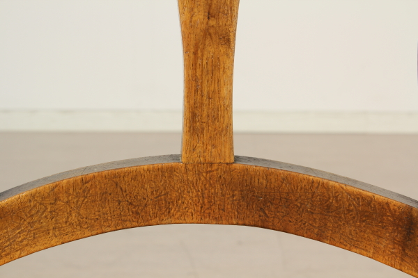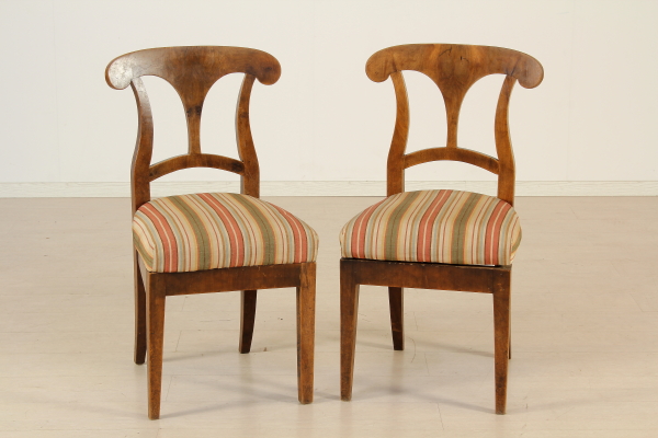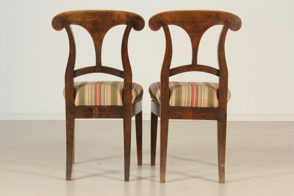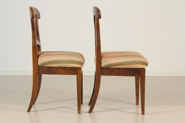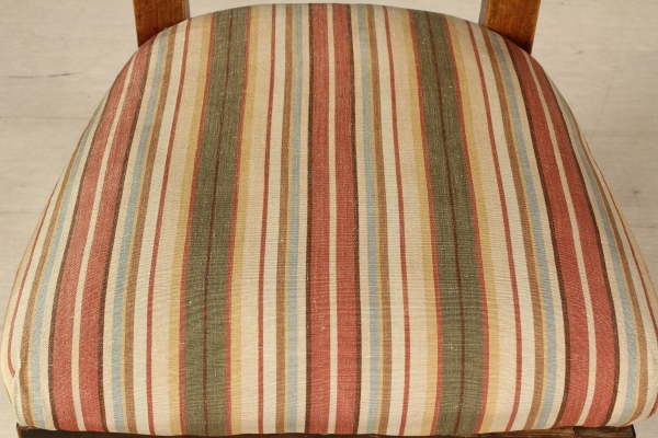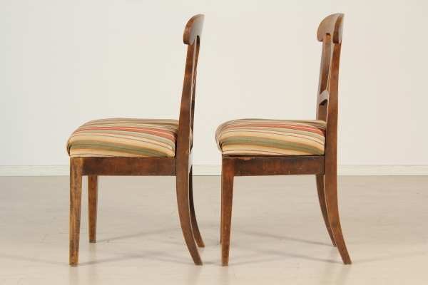 Sedie rette da gambe tronco-piramidali, presenta sedute imbottite e schienale a giorno dalla linea mossa. Schienale a fasce lastronate.