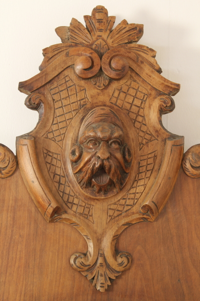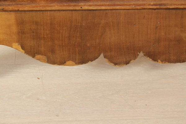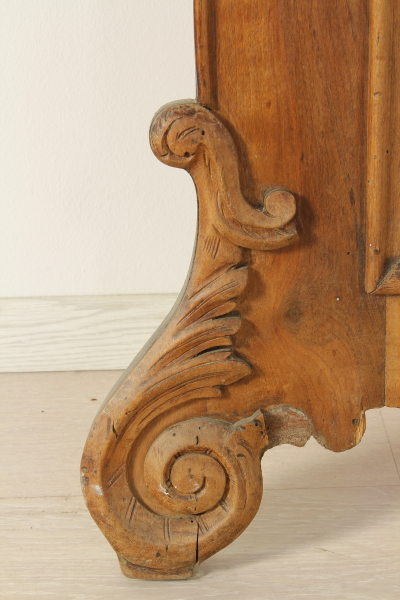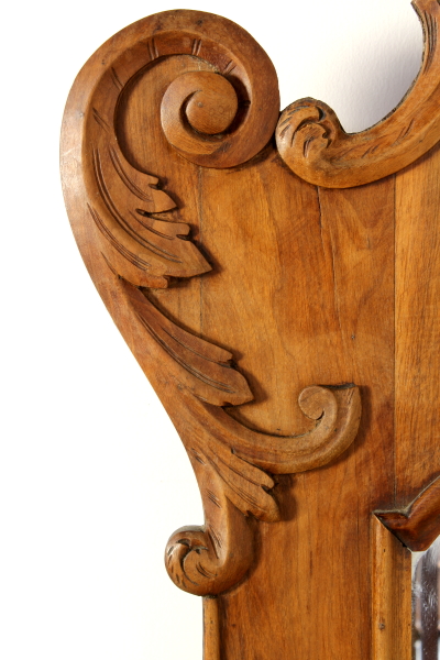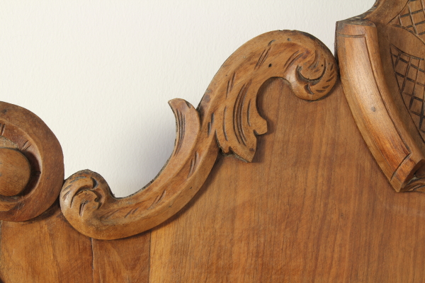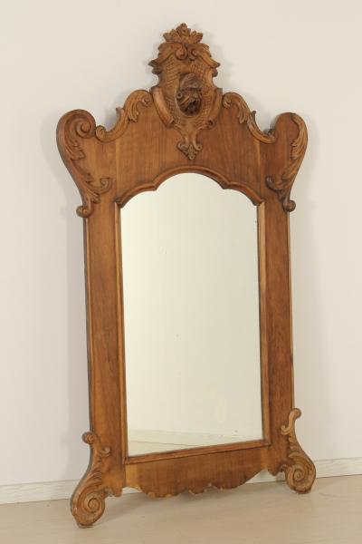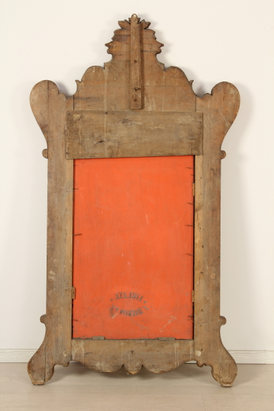 Specchiera dalla linea mossa, presenta volute intagliate ai quattro angoli. Cimasa intagliata con figura allegorica. Specchio sagomato.
