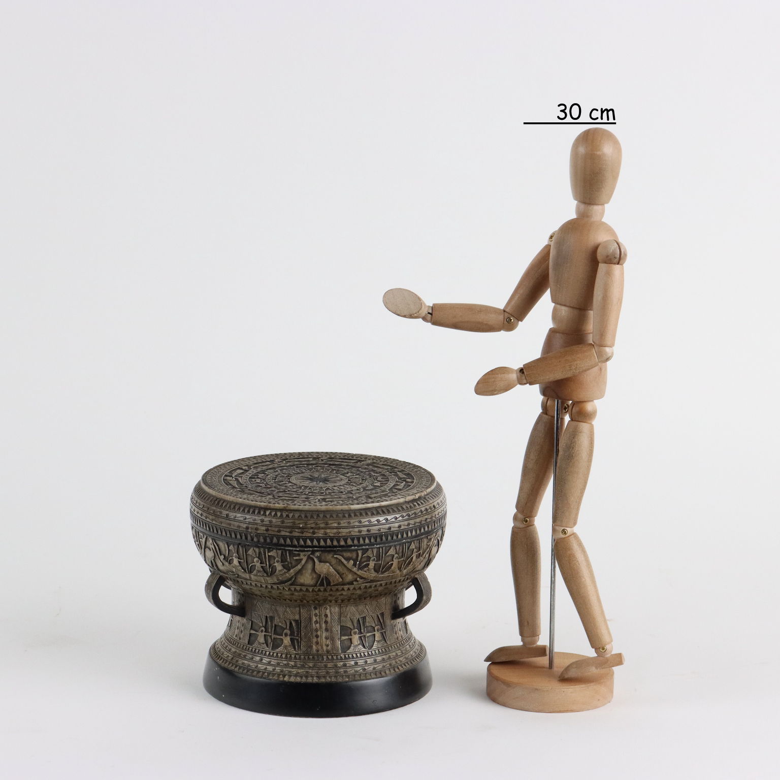 Piccolo recipiente in pietra saponaria a forma di tamburo rituale. Completamente intagliato con una fitta decorazione a fasce con motivo di animali stilizzati ed una stella nella parte centrale del coperchio, l'oggetto richiama i tamburi rituali in bronzo della cultura vietnamita Dong Son.
