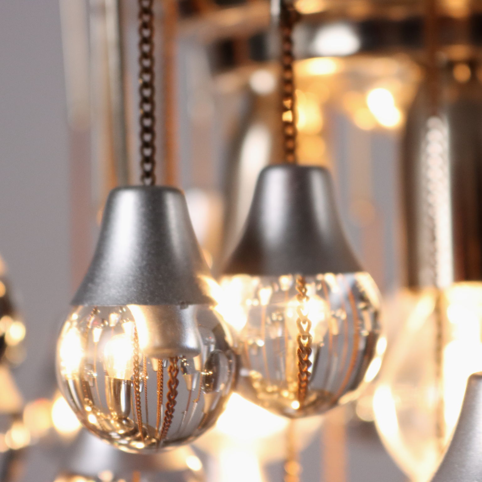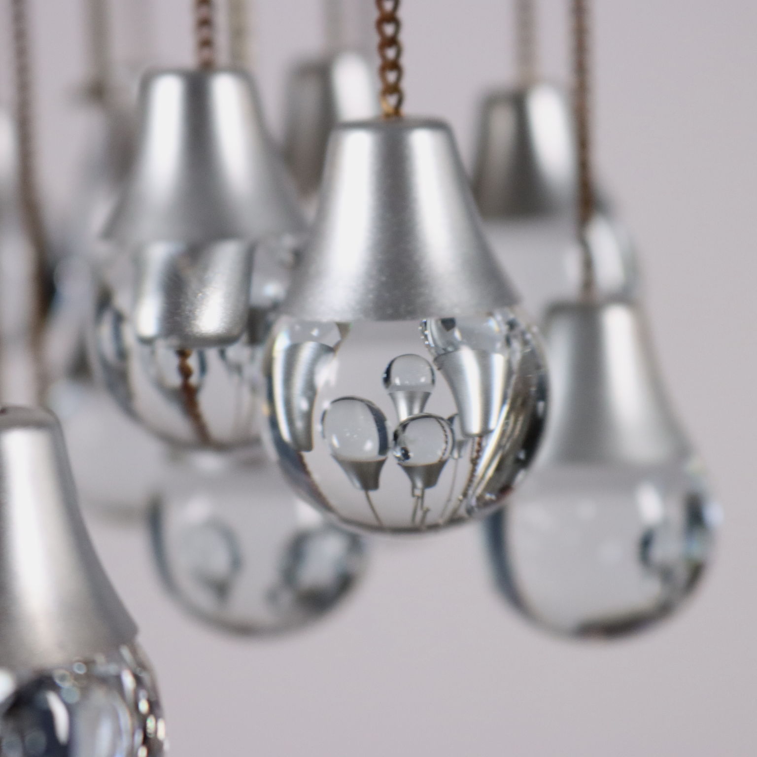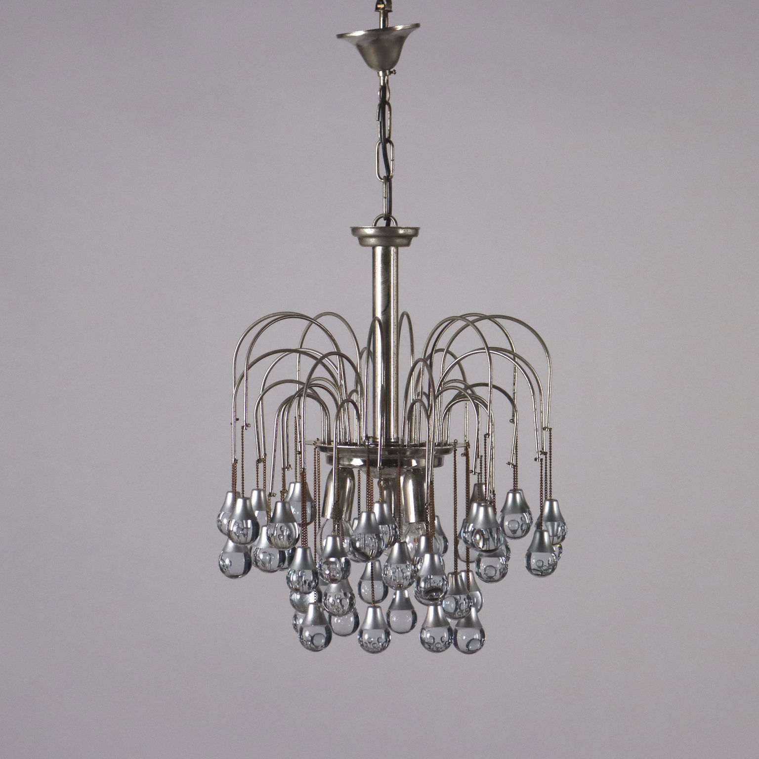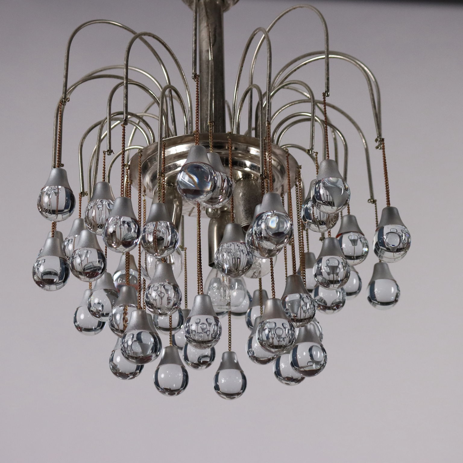 Lampada a soffitto in metallo e alluminio cromati, con pendenti sferici in vetro.