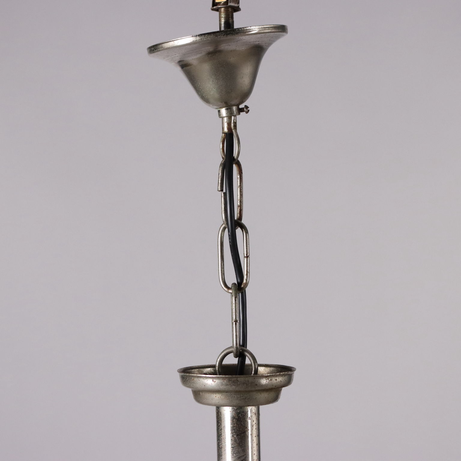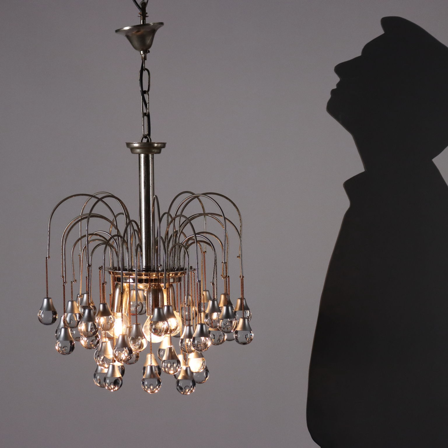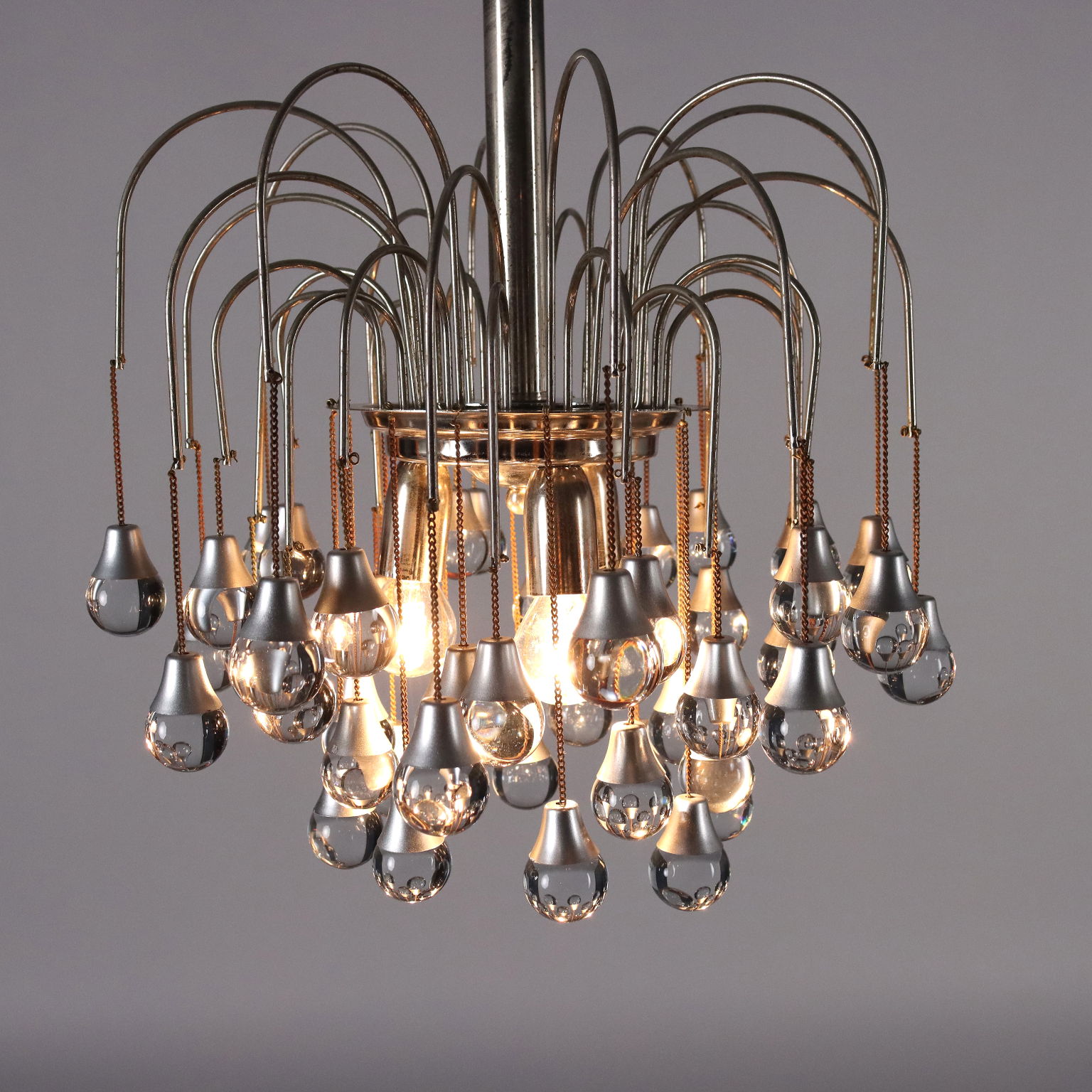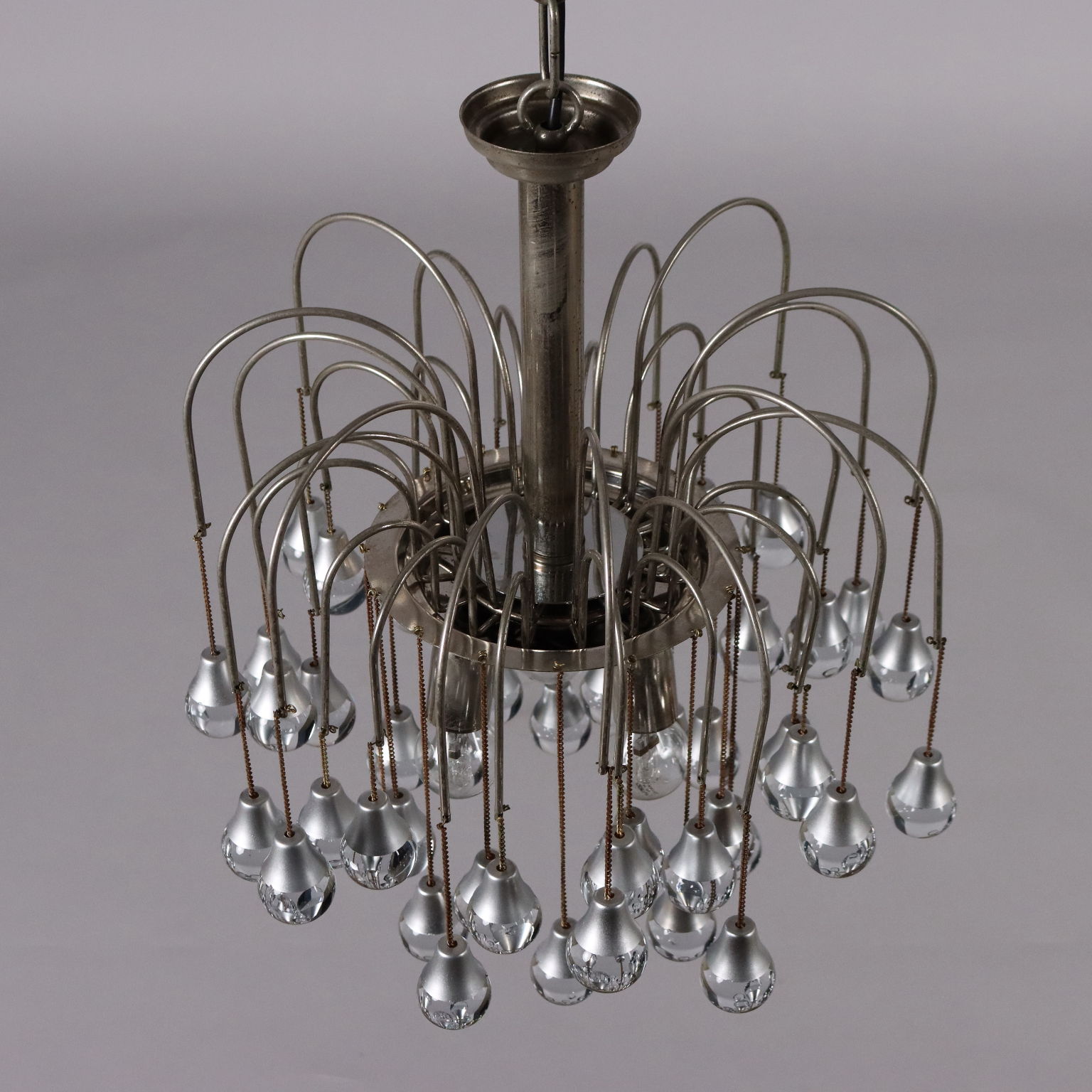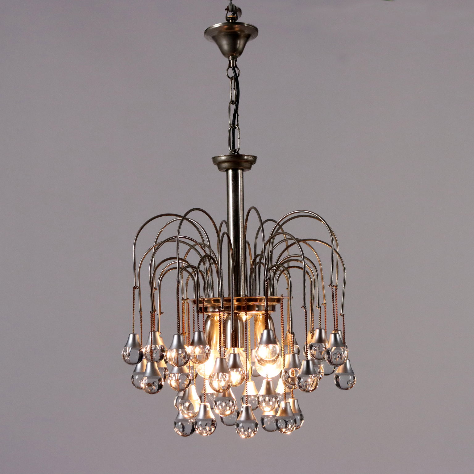 Lampada a soffitto in metallo e alluminio cromati, con pendenti sferici in vetro.