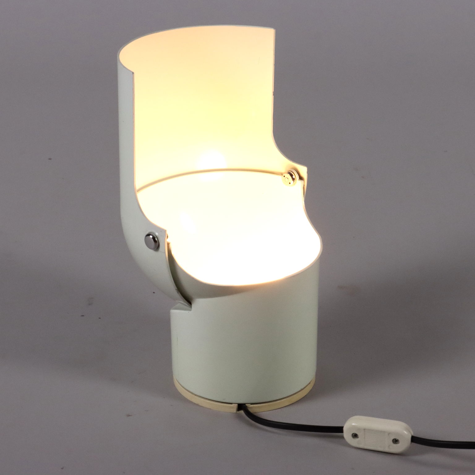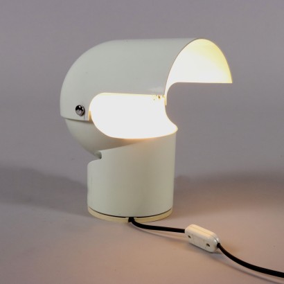Iconica lampada da tavolo modello 'Pileino' in metallo laccato bianco. Grazie al paralume mobile può assumere diverse posizioni e creare vari effetti di luce.