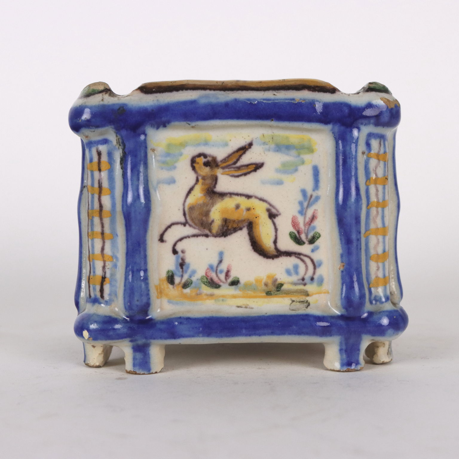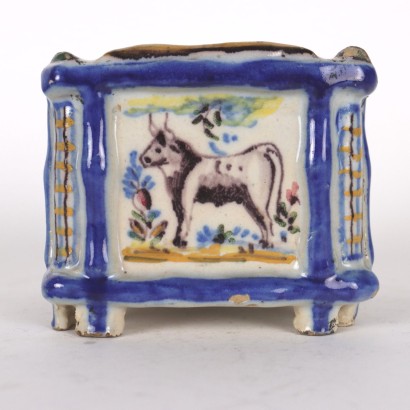 Calamaio in ceramica maiolicata con decoro in blu e ocra. Nelle riserve figure di animali e scena di caccia.