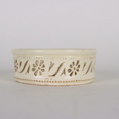 Gruppo di tre sottobottiglia in terraglia con bordo finemente traforato.