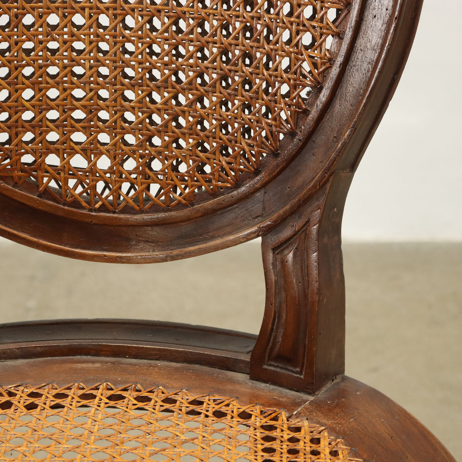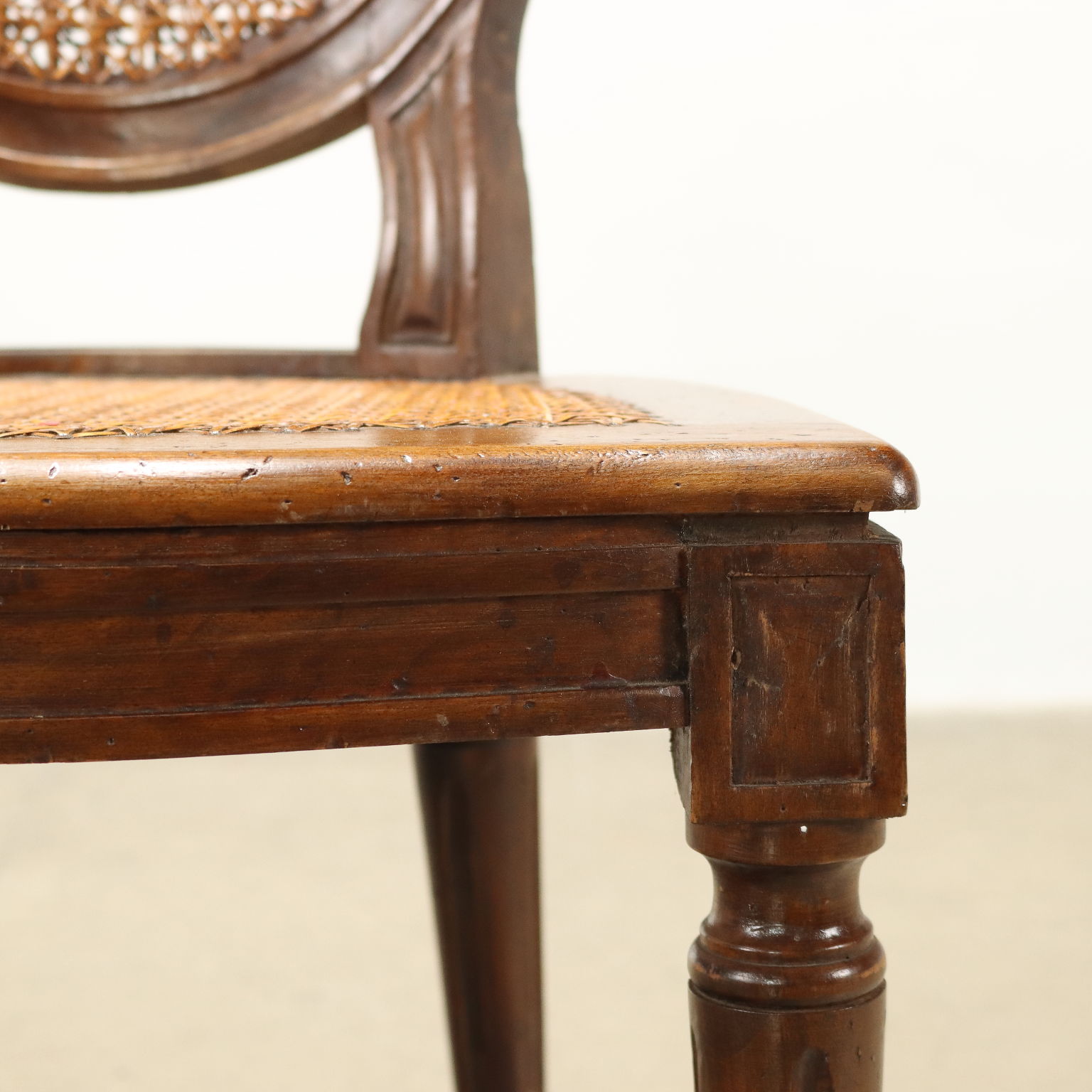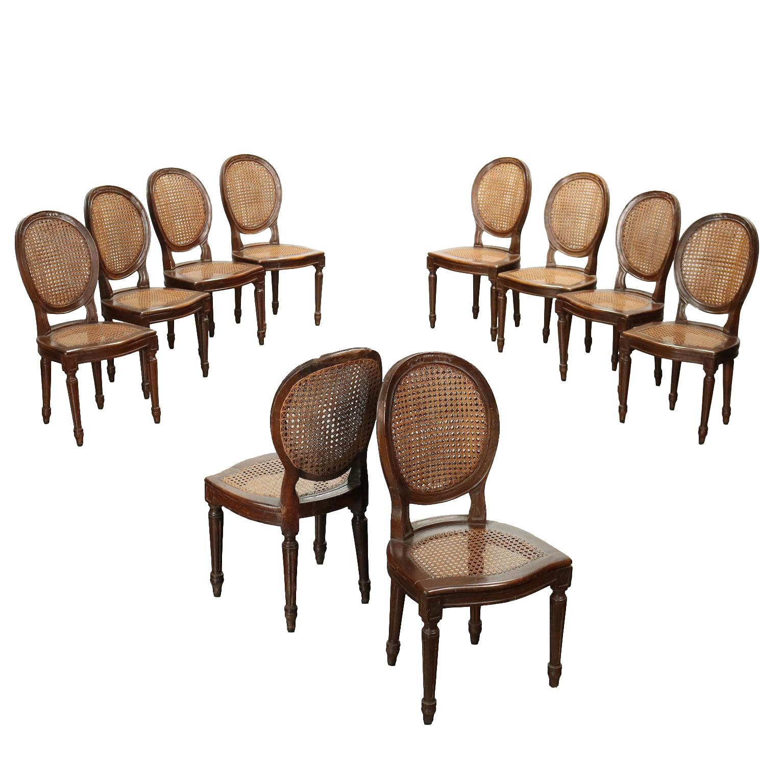 Gruppo di dieci sedie in noce composto da nove sedie in stile neoclassico e da una sedia antica di epoca neoclassica, utilizzata come modello di riferimento per le restanti. Schienali a medaglione con doppia incannucciatura e motivo a nastro intagliato posto alla sommità, grembiale mosso, gambe troncoconiche scanalate terminanti con piedi a pera. Seduta incannucciata.