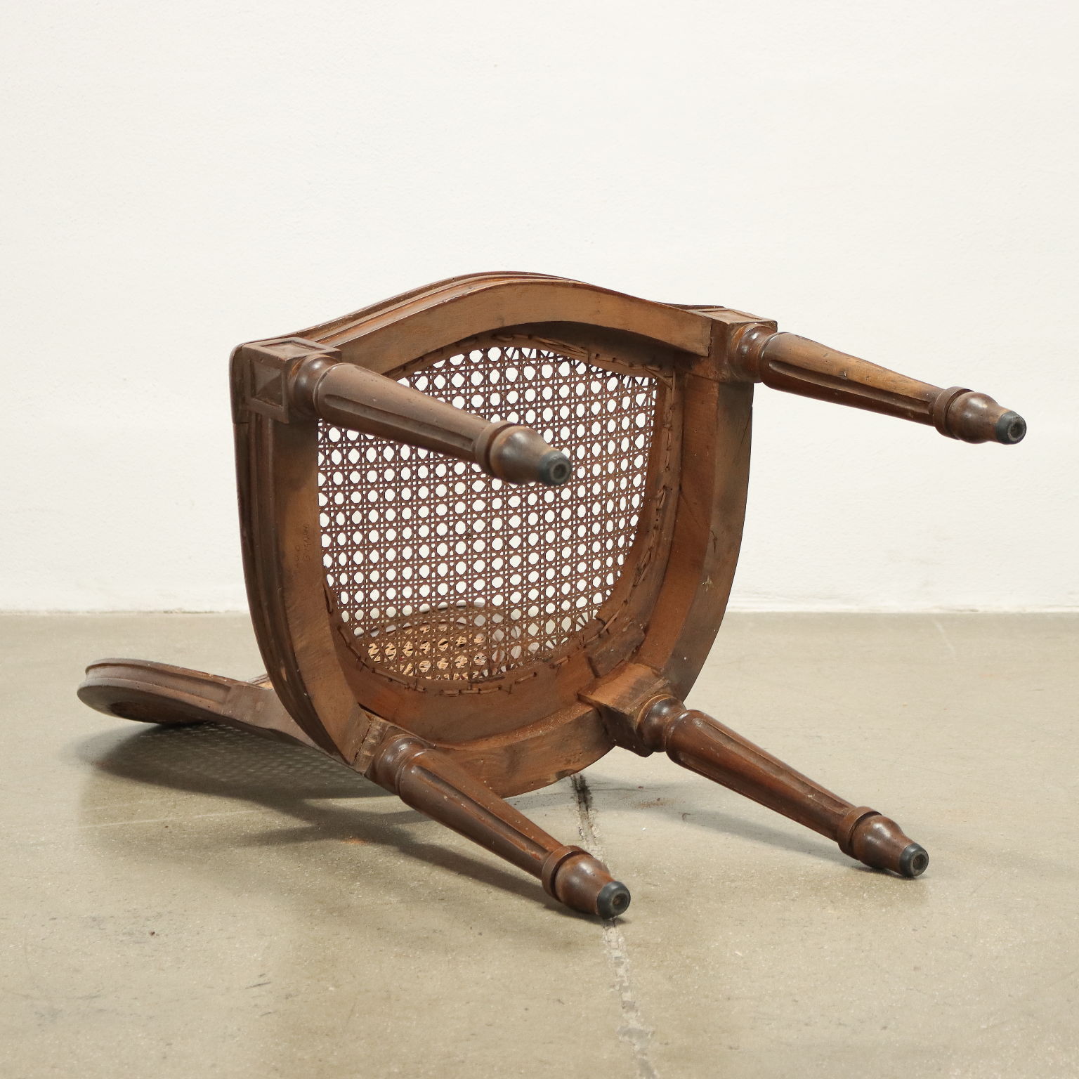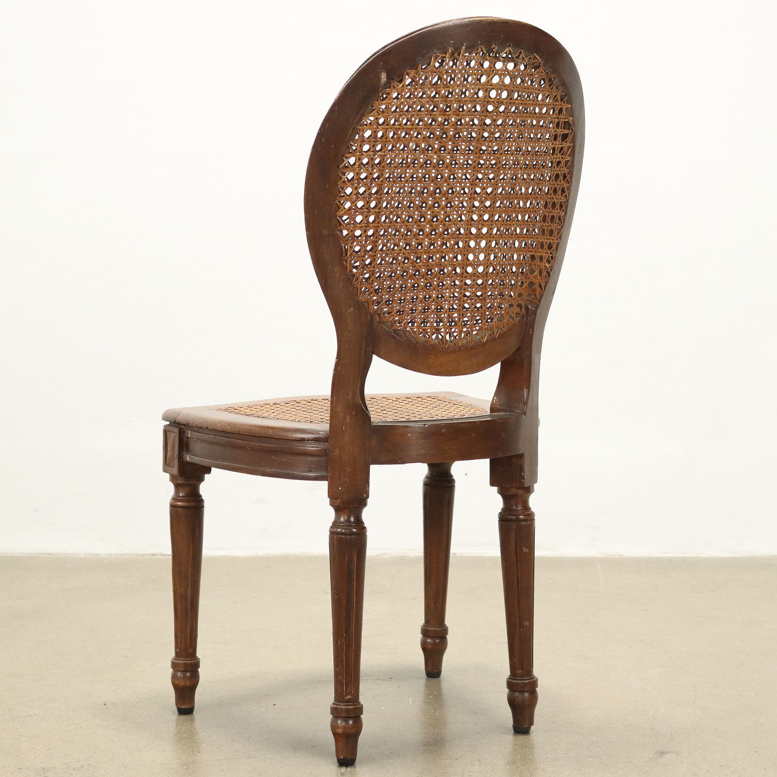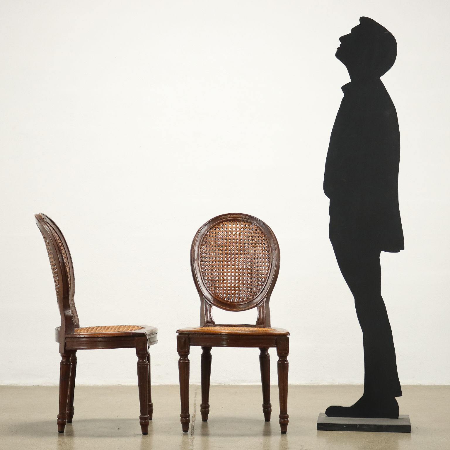 Gruppo di dieci sedie in noce composto da nove sedie in stile neoclassico e da una sedia antica di epoca neoclassica, utilizzata come modello di riferimento per le restanti. Schienali a medaglione con doppia incannucciatura e motivo a nastro intagliato posto alla sommità, grembiale mosso, gambe troncoconiche scanalate terminanti con piedi a pera. Seduta incannucciata.