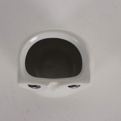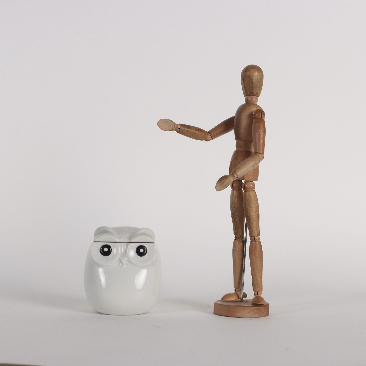 Barattolo a foggia di gufo di Piero Fornasetti. Sotto la base marchio della manifattura.