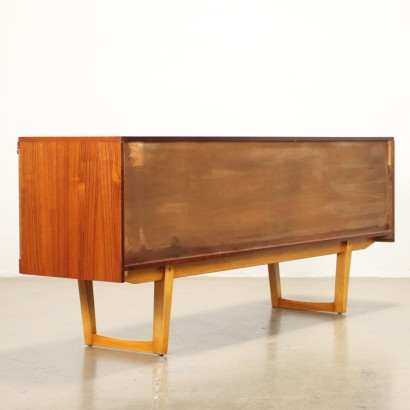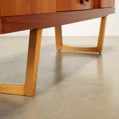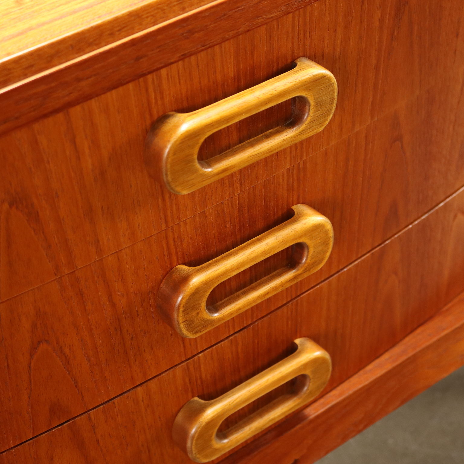 Sideboard vintage anni '60 di manifattura inglese con cassetti a vista sotto piano dalla forma leggermente bombata, ante battenti laterali con maniglie in vetro curvato. Legno impiallacciato teak.
