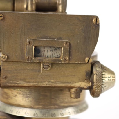 Teodolite in ottone poggiante su base circolare in legno; inclusi bussola, cannocchiale e livella a bolla per garantire maggiore precisione.