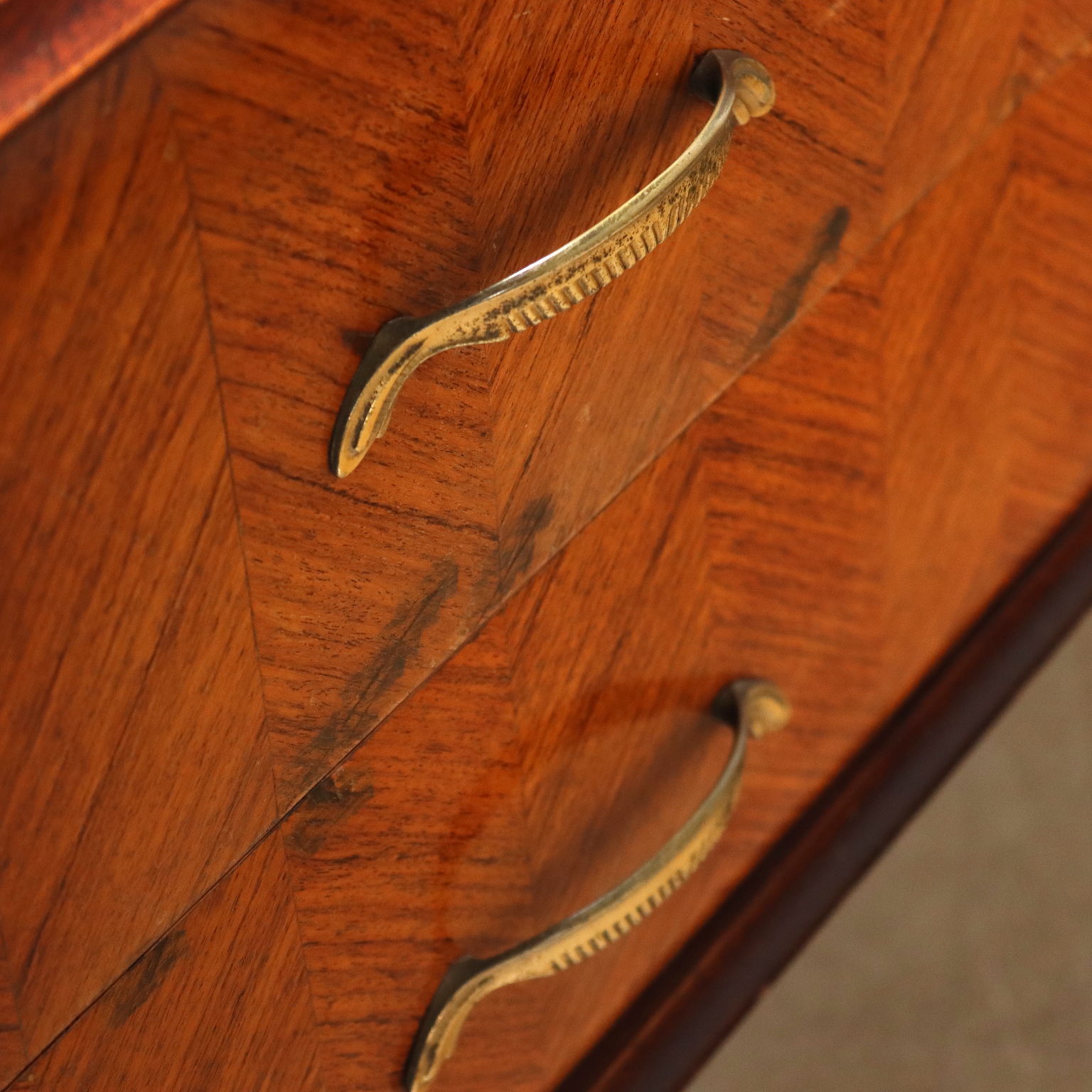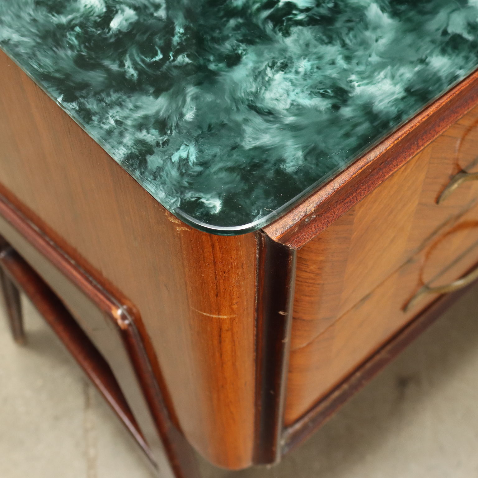 Classico comò vintage di manifattura italiana con specchio, gambe in legno di faggio tinto, otto cassetti in legno impiallacciato bois de rose, maniglie in ottone e bellissimo piano verde in vetro retro trattato. Arredo non restaurato ma in buone condizioni generali.