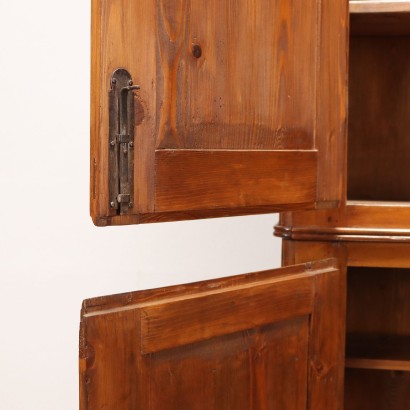 Credenza con fronte con due ante decorate con semplici cartelle nel corpo superiore e due nel corpo inferiore. Montanti decorati con scanalature terminanti con piedi a mensola. Struttura in abete. Italia inizio XX secolo