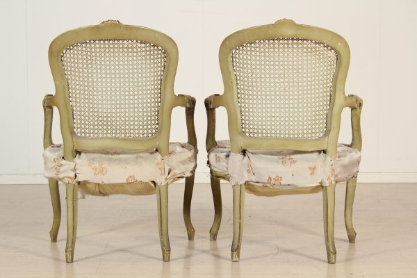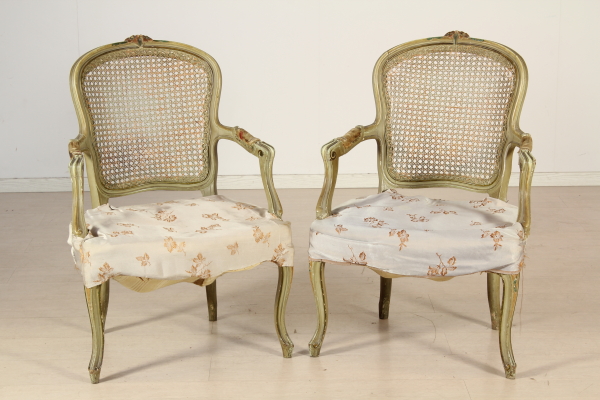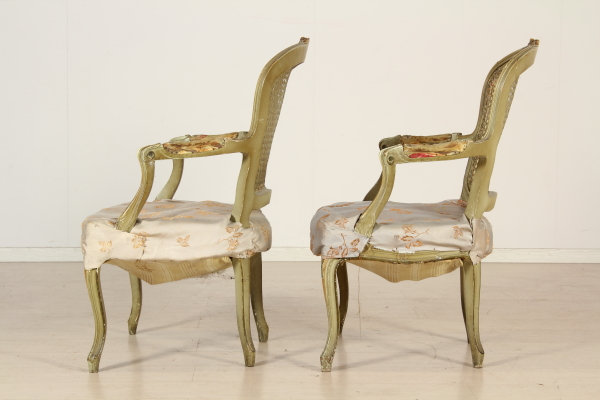 Coppia di poltrone con montanti e gambe mosse e intagliate. Sedute imbottite, schienale in paglia di Vienna braccioli a giorno.