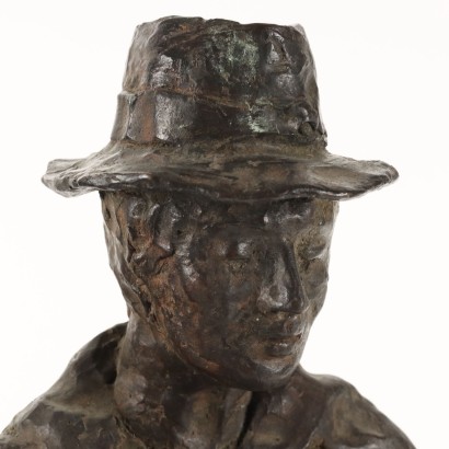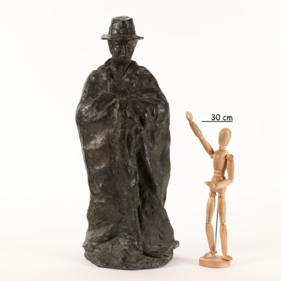 Scultura in bronzo. Firma non identificata e data sulla base. La scultura propone una figura maschile avvolta in un lungo mantello, che nasconde tutto il corpo, e sul capo un cappello ben calcato, a ombreggiare il volto serio, quasi triste.