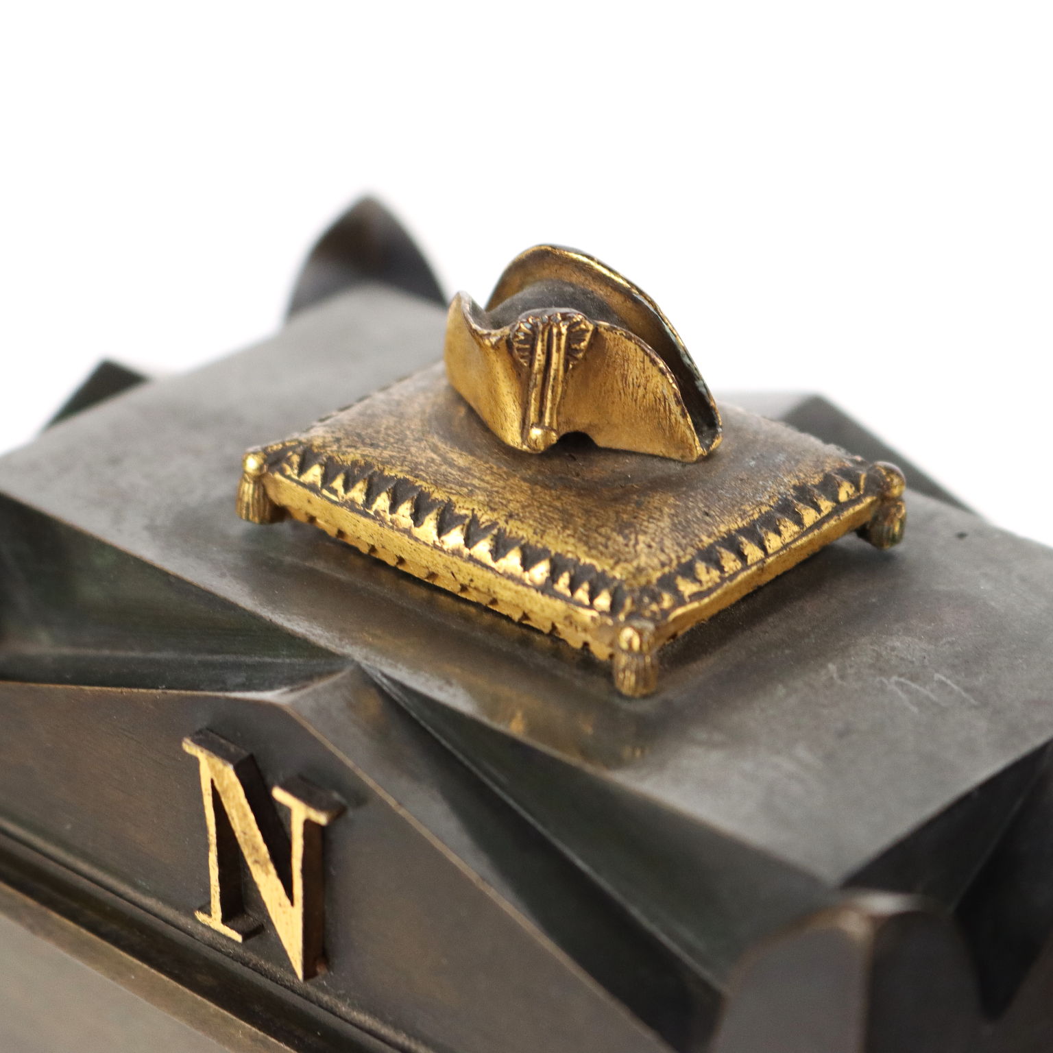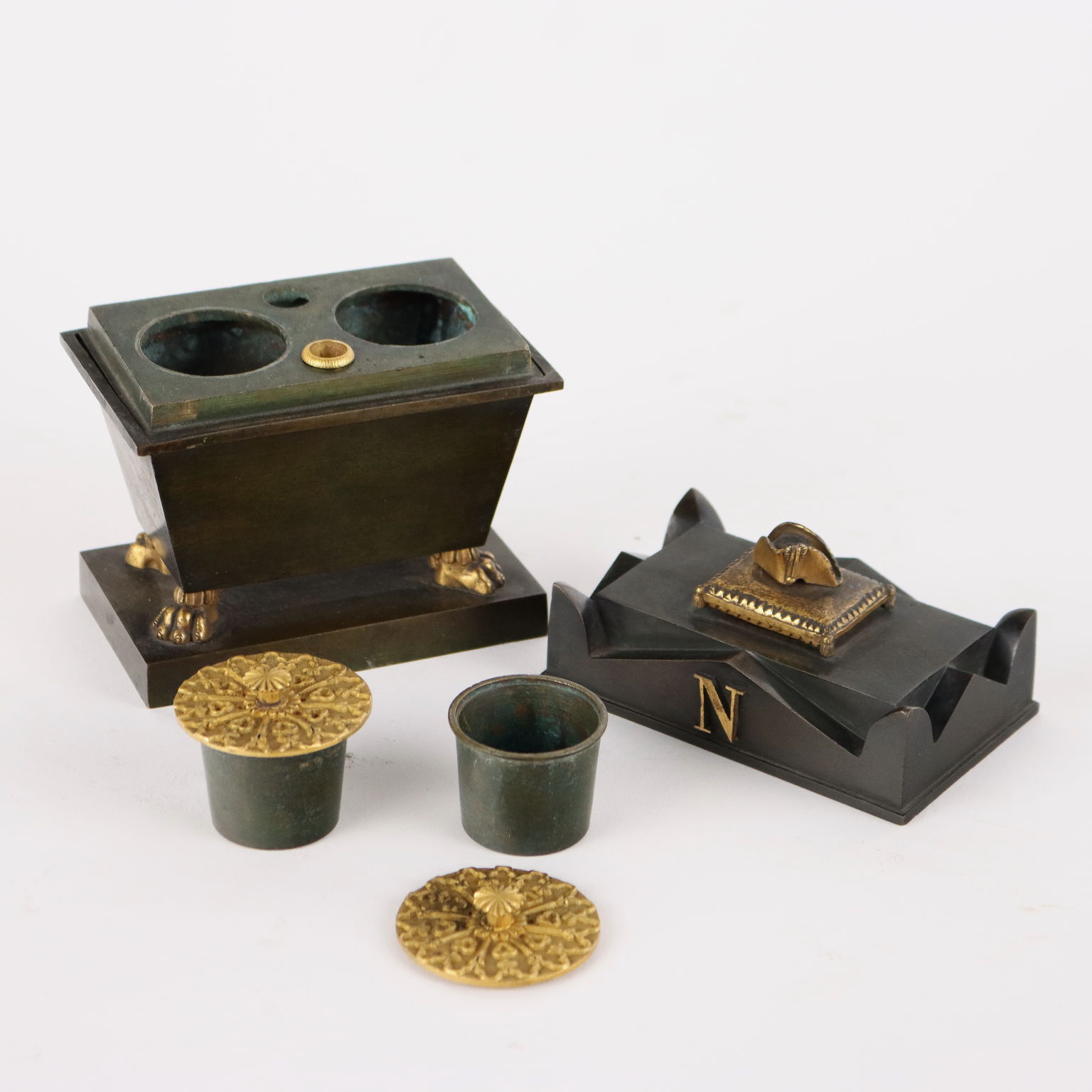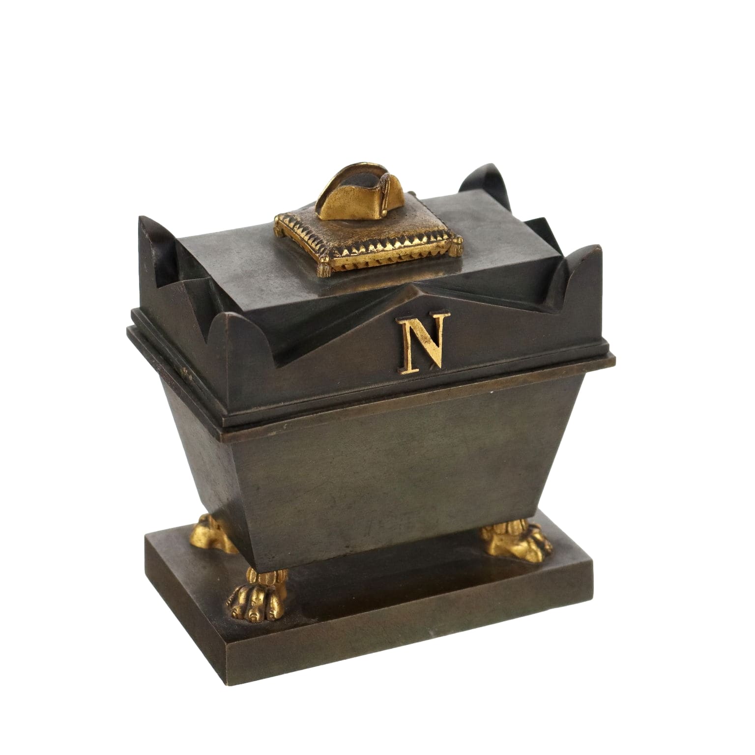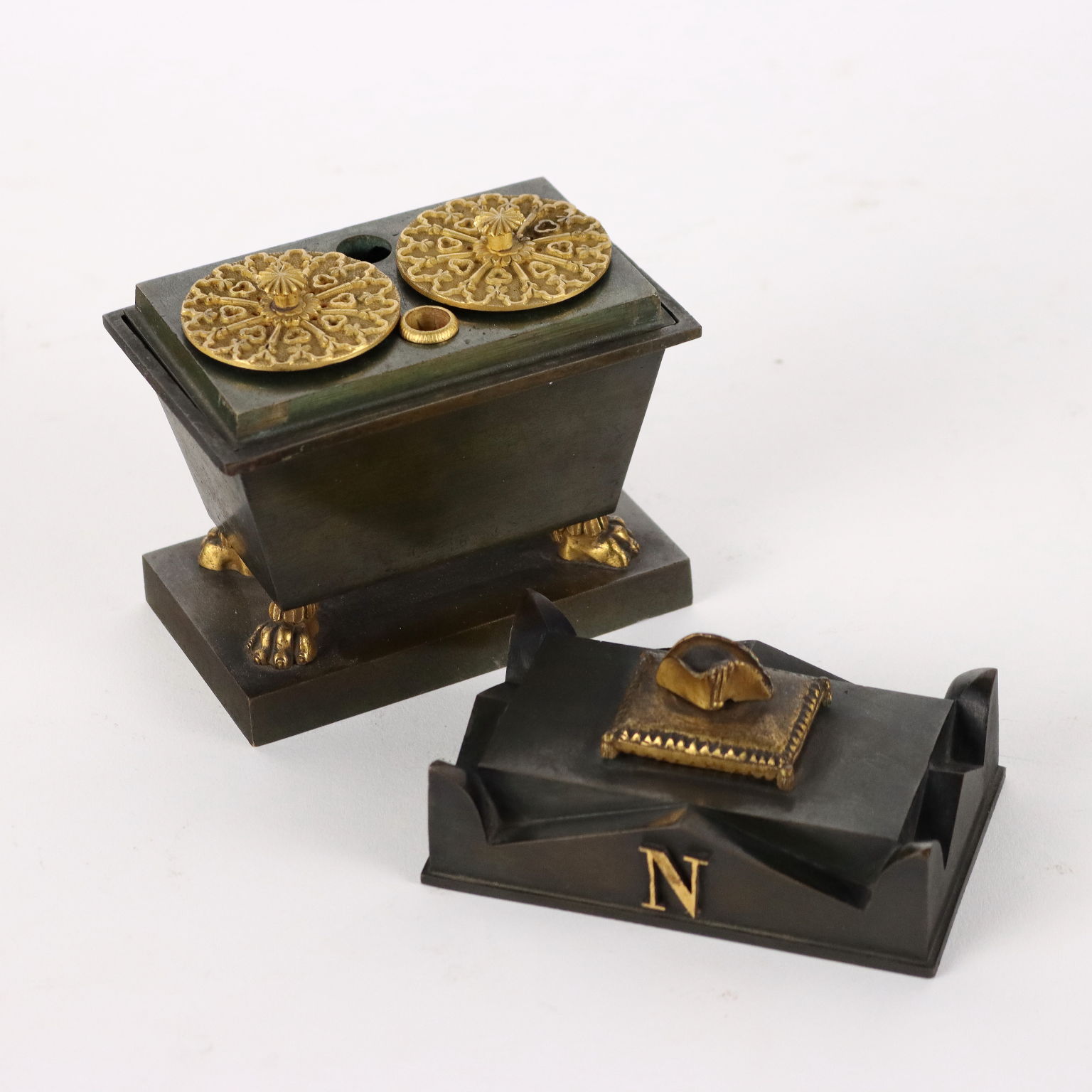 Calamaio in bronzo a foggia di sarcofago con elementi dorati. All'interno piccola scultura in bronzo dorato raffigurante la salma di Napoleone.
