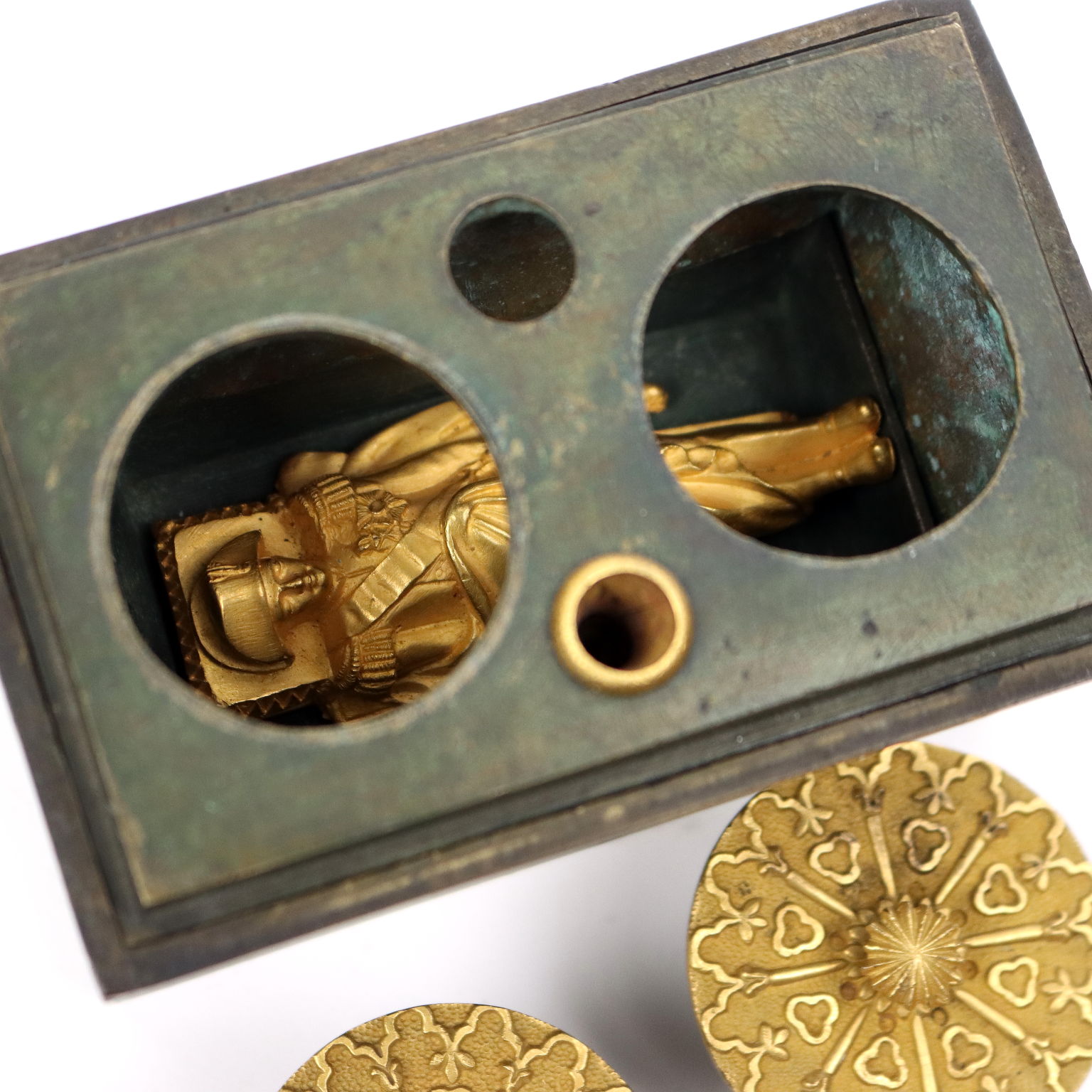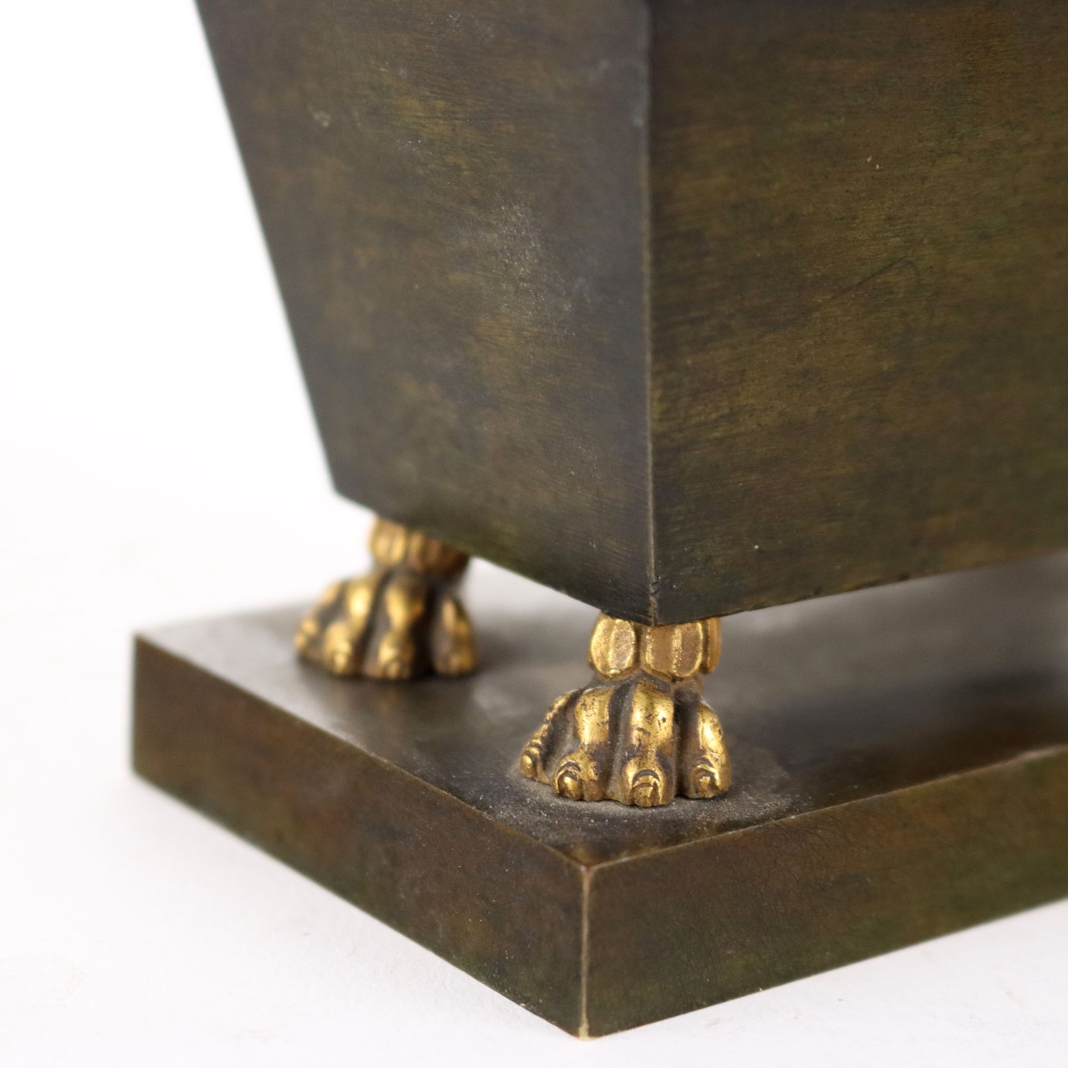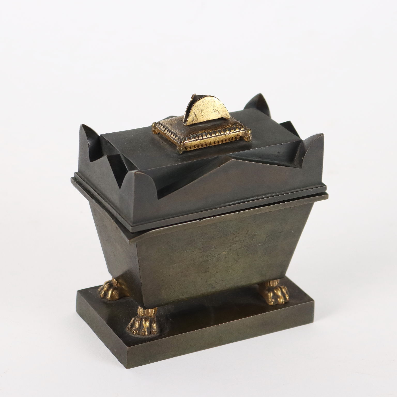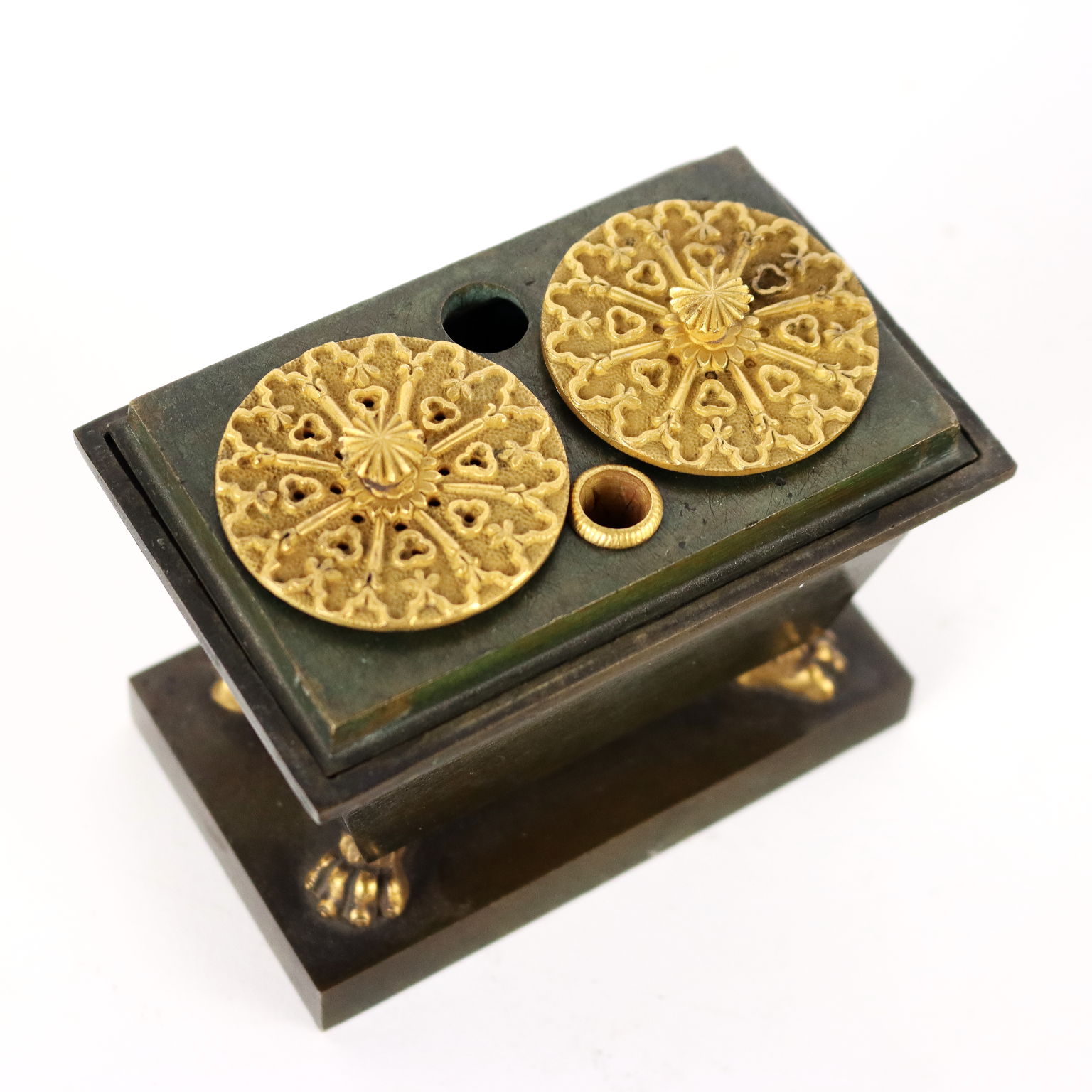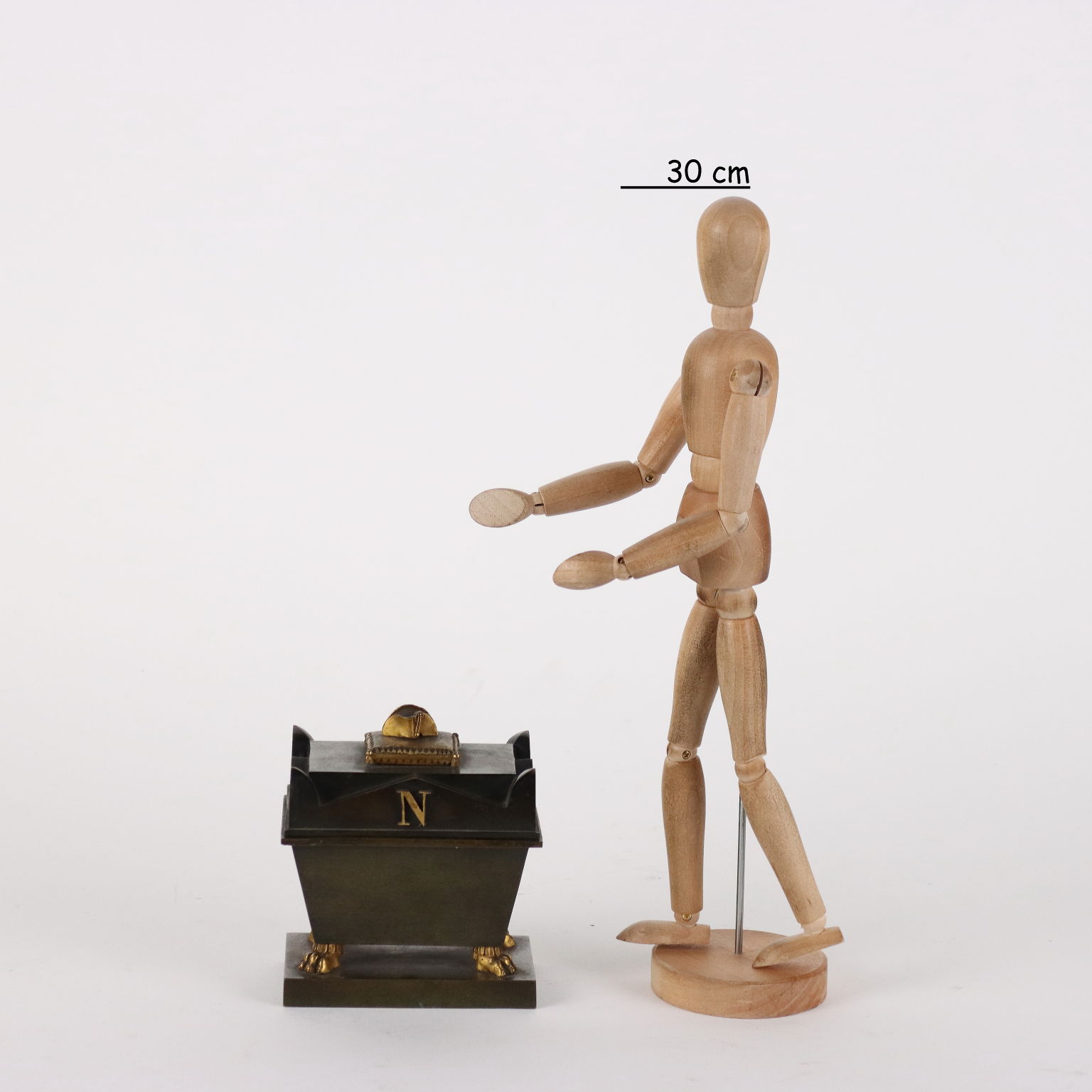 Calamaio in bronzo a foggia di sarcofago con elementi dorati. All'interno piccola scultura in bronzo dorato raffigurante la salma di Napoleone.