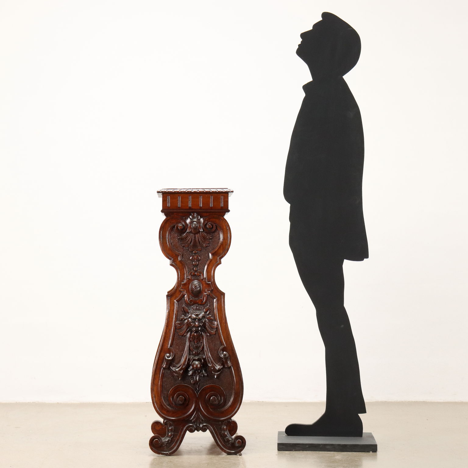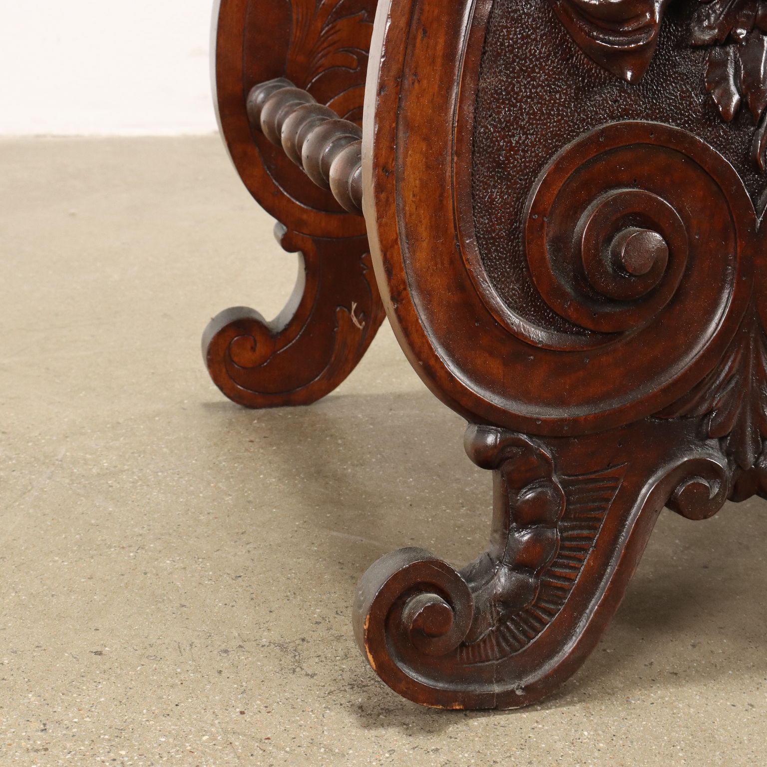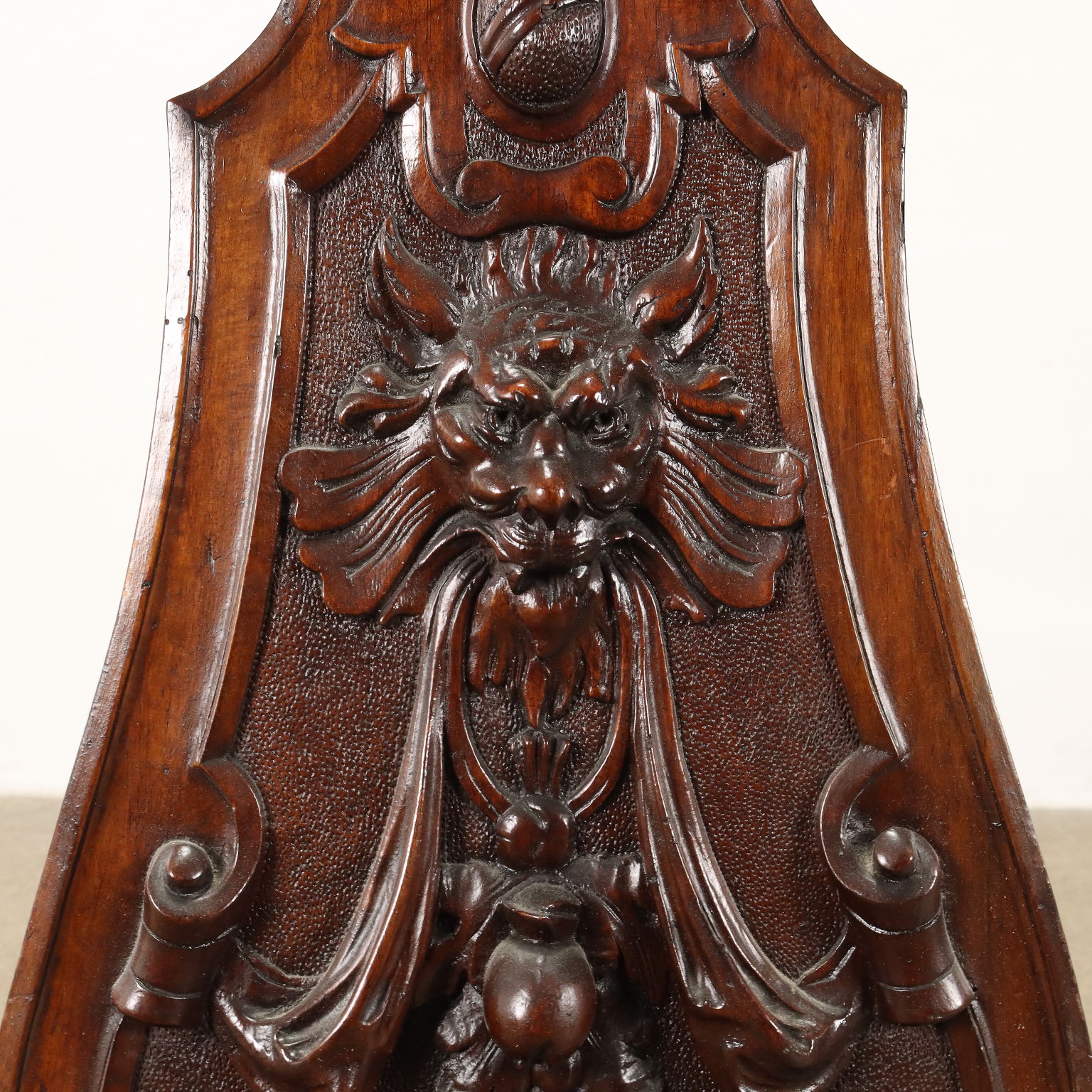 Sgabellone da parete in noce riccamente intagliato sul fronte a raffigurare mascherone e blasone centrale entro volute. Traverse di raccordo tornite e piedi a ricciolo. Italia seconda metà XIX secolo