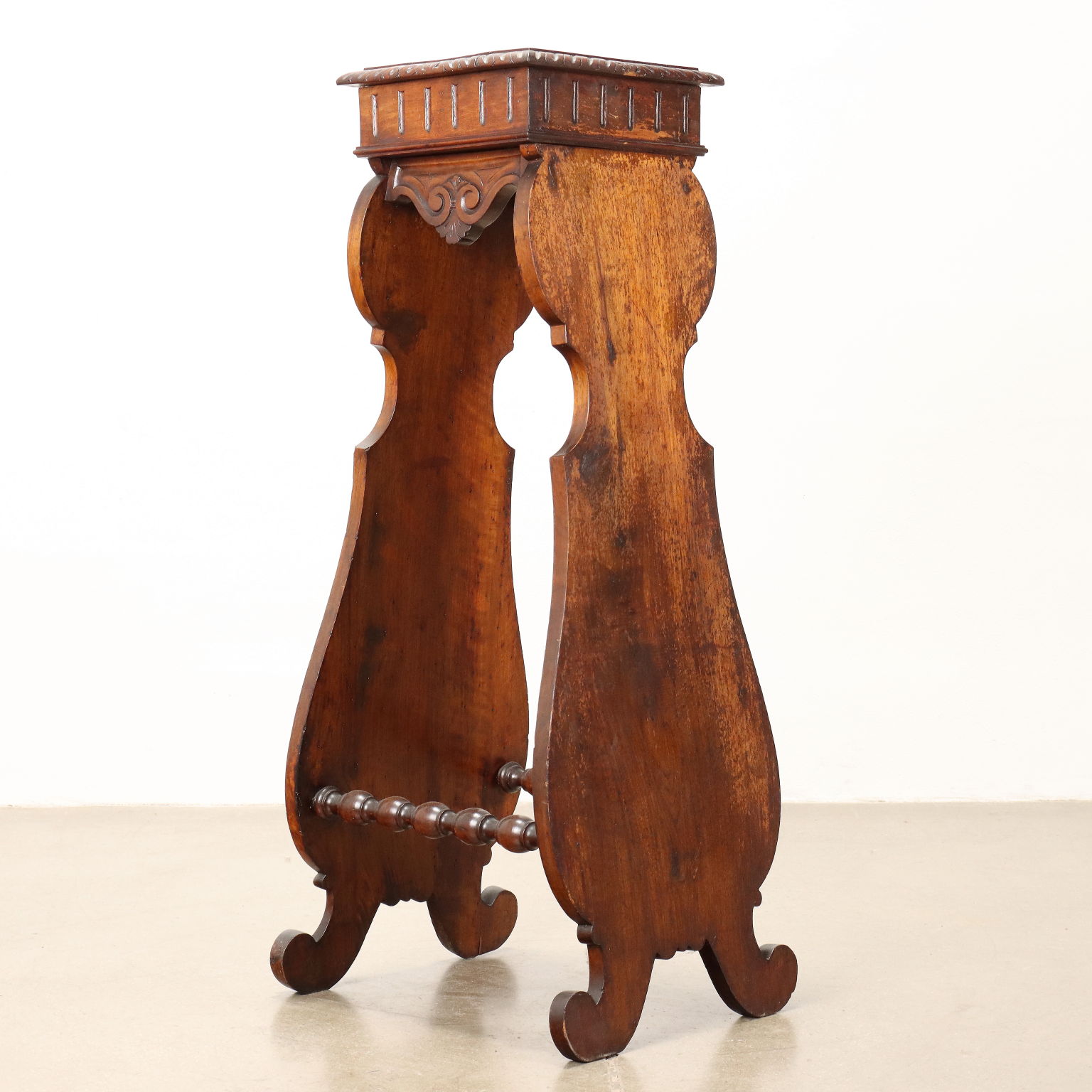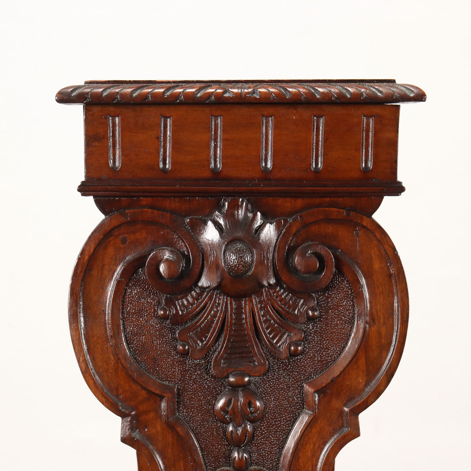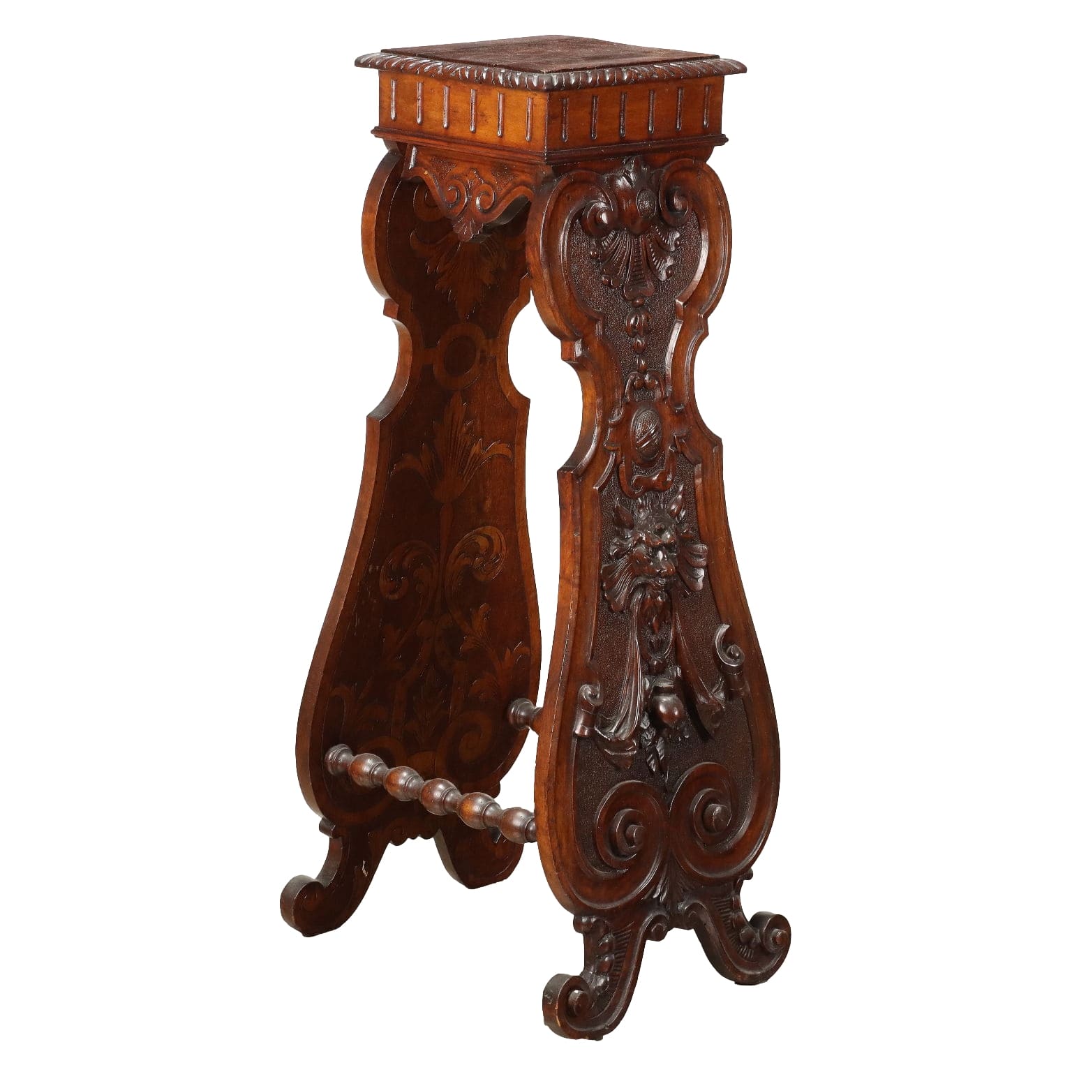 Sgabellone da parete in noce riccamente intagliato sul fronte a raffigurare mascherone e blasone centrale entro volute. Traverse di raccordo tornite e piedi a ricciolo. Italia seconda metà XIX secolo
