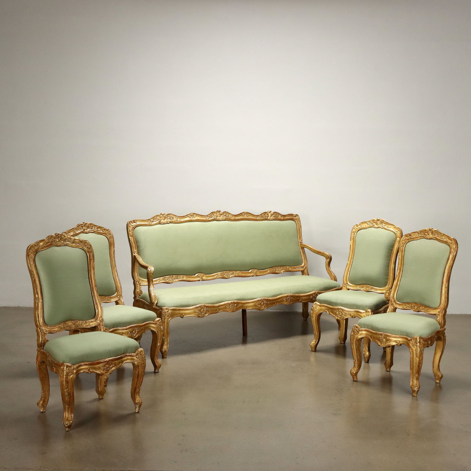 Sedie con schienale, braccioli, fascia sotto seduta e gambe mossi e intagliati a formare motivi fitomorfi. Tre sedie sono del XIX secolo, una è stata rifatta. Italia fine XIX secolo
