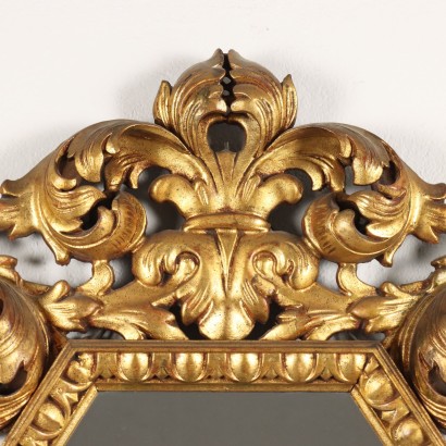 Specchiera in stile barocco con cornice in legno intagliato e dorato, decorato con elementi fogliacei disposti a ricciolo e cimasa con foglie entro volute. Italia XX secolo