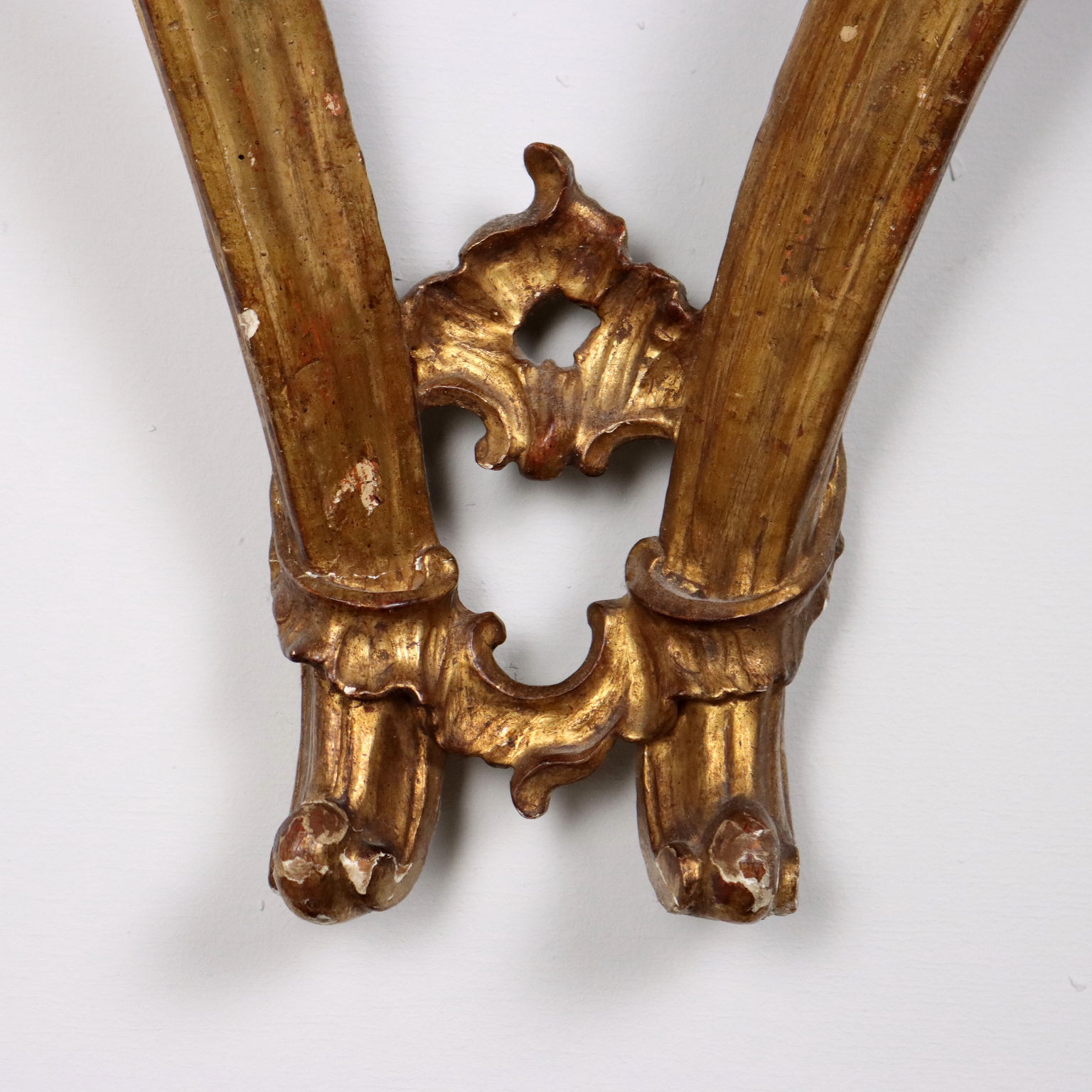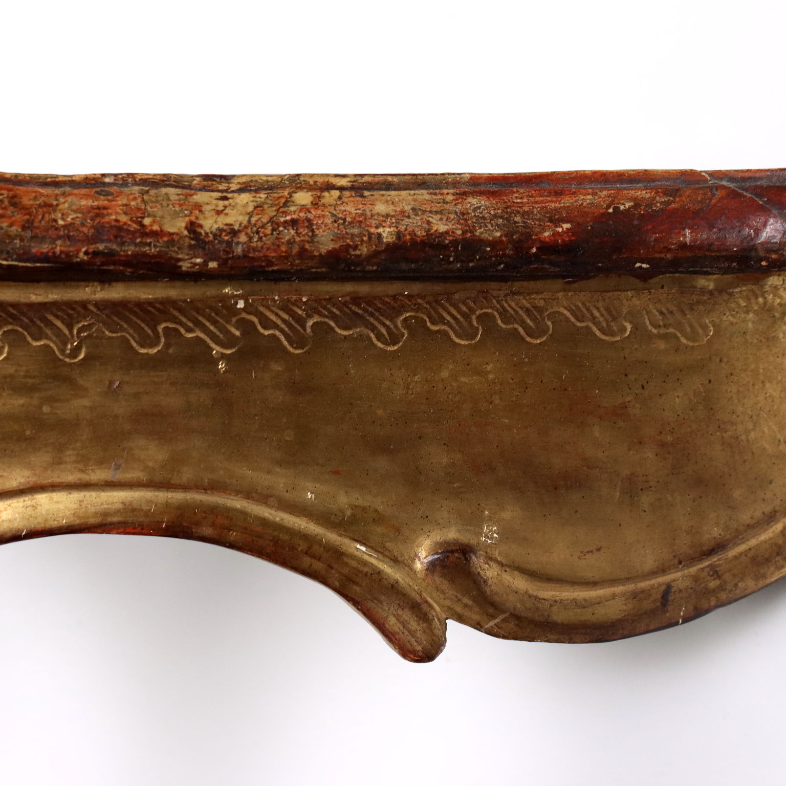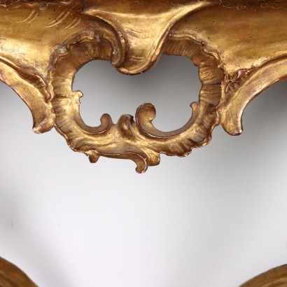Consolle in legno dorato e intagliato con piano decorato a finto marmo, grembiale decorato con motivi a ricciolo e rocaille come le gambe. Sostituzioni e restauri. Lombardia metà XVIII secolo