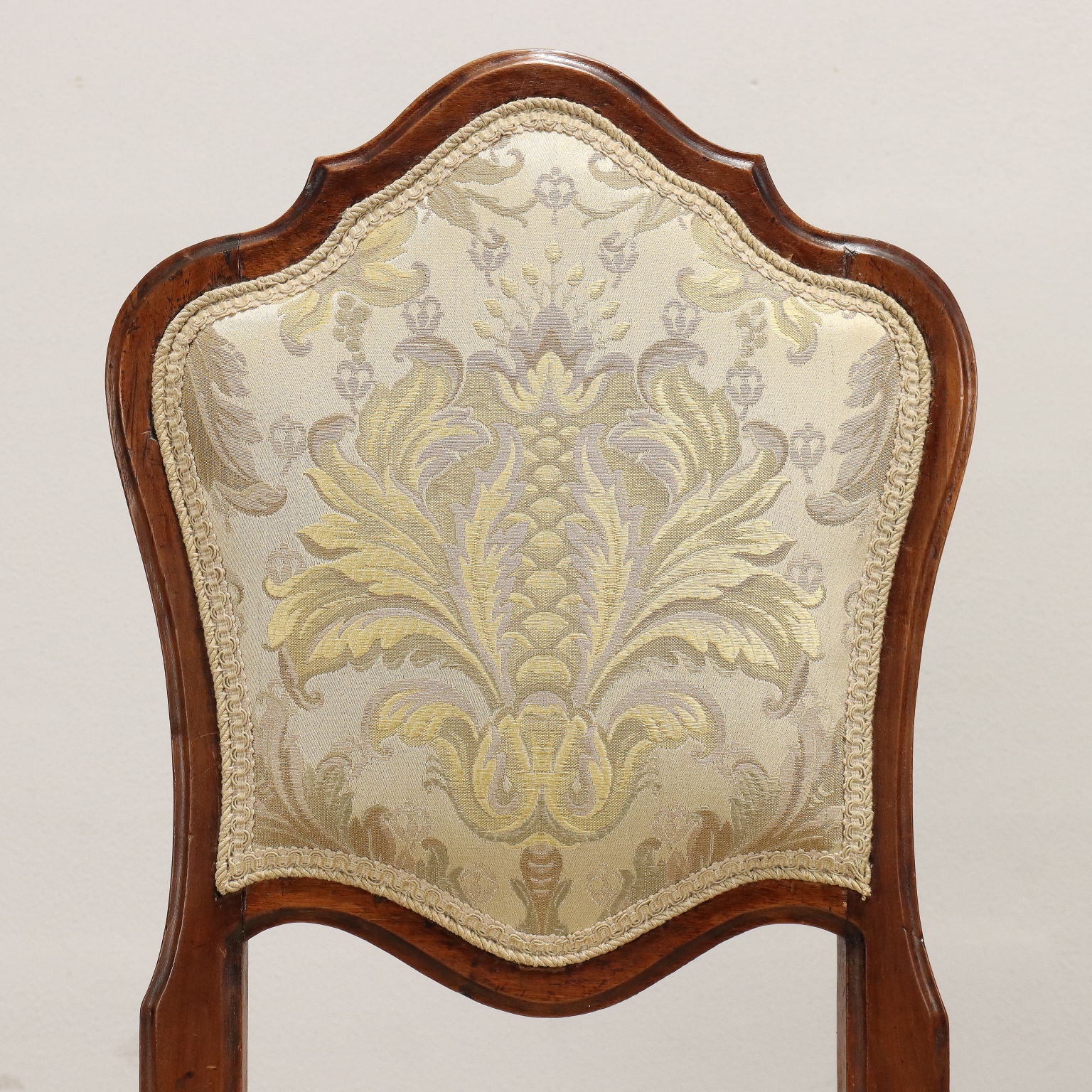 Sedie in stile barocchetto in noce con schienale sagomato e imbottito come la seduta, gambe a rocchetto raccordate da traversa centrale. Una delle sedie è rifatta. Italia XIX secolo