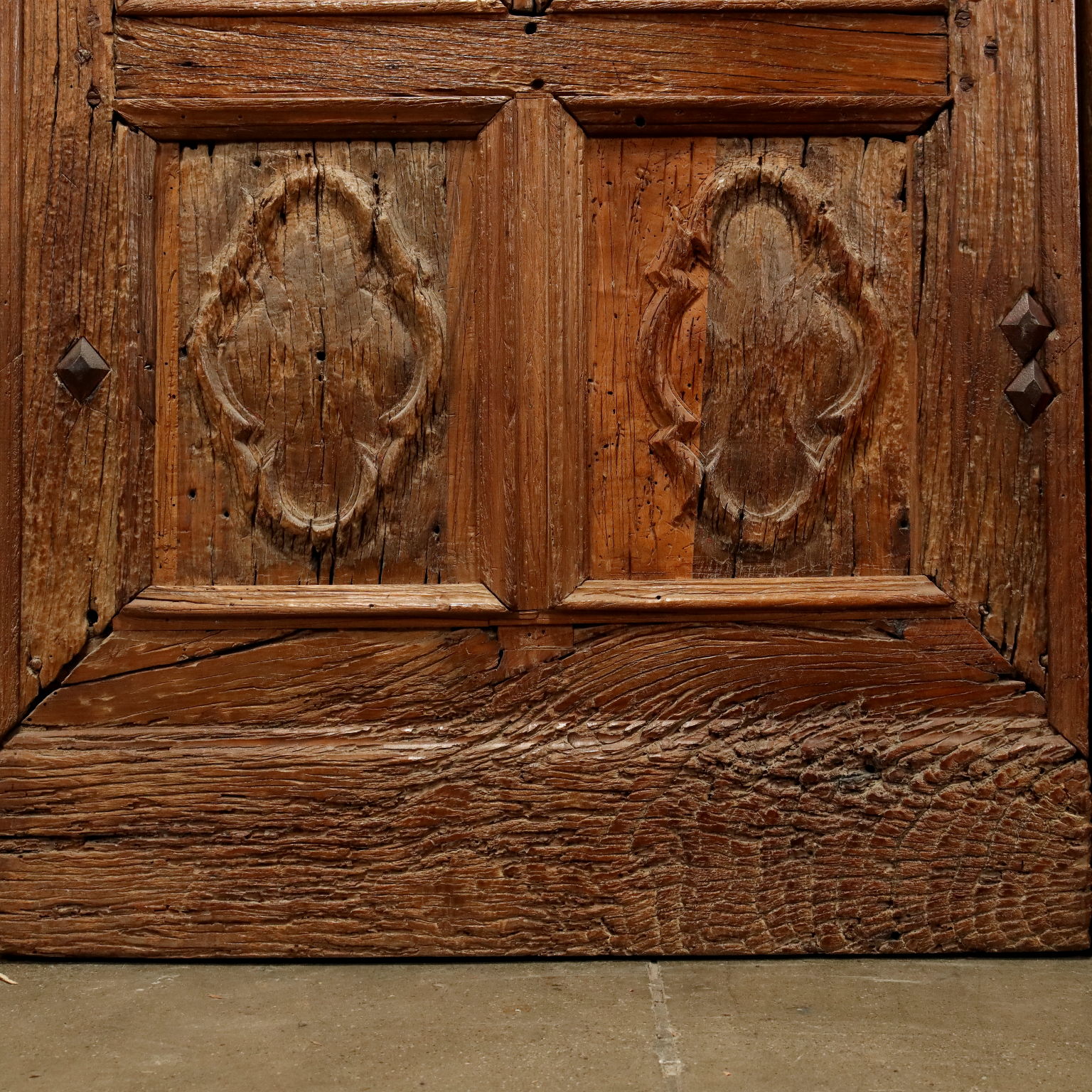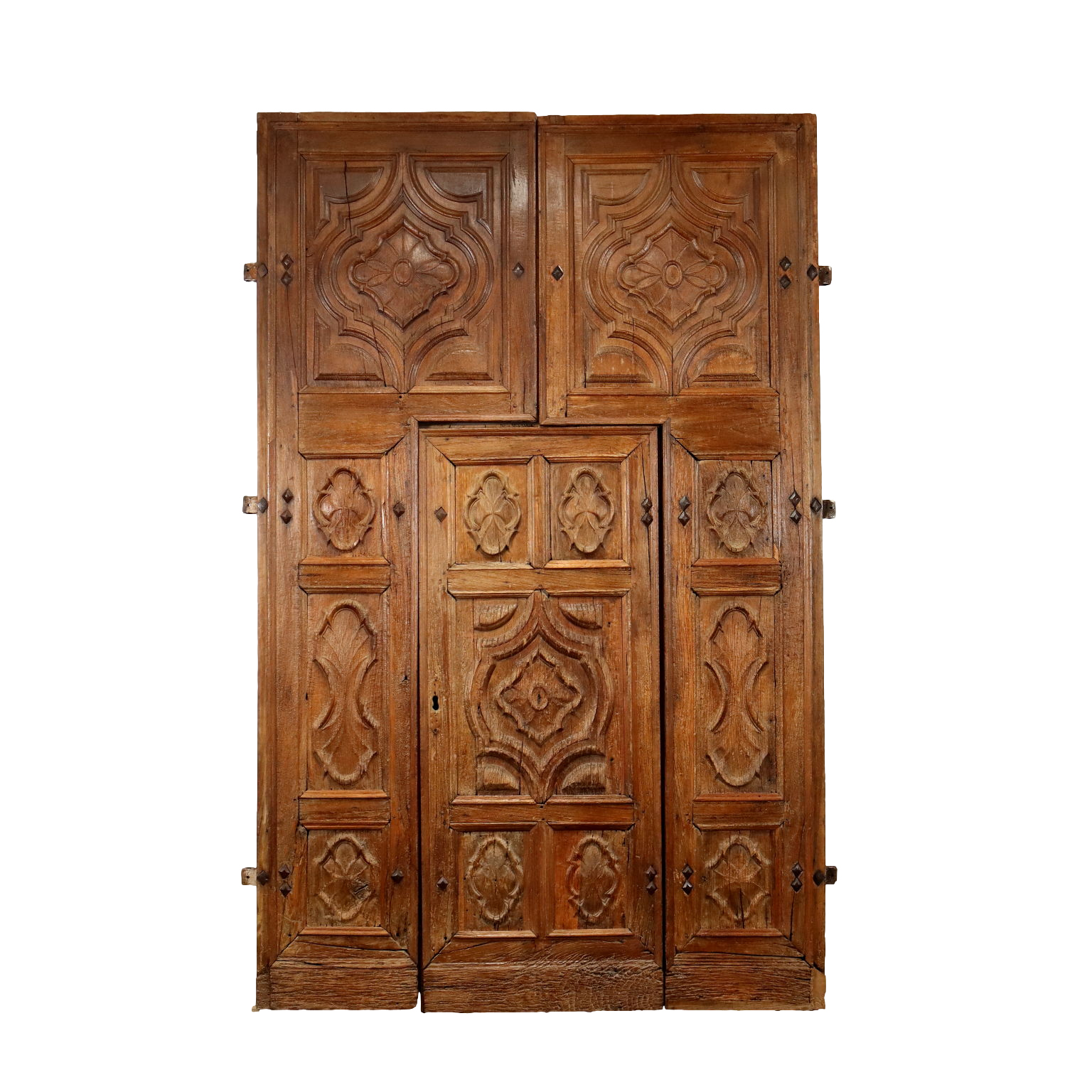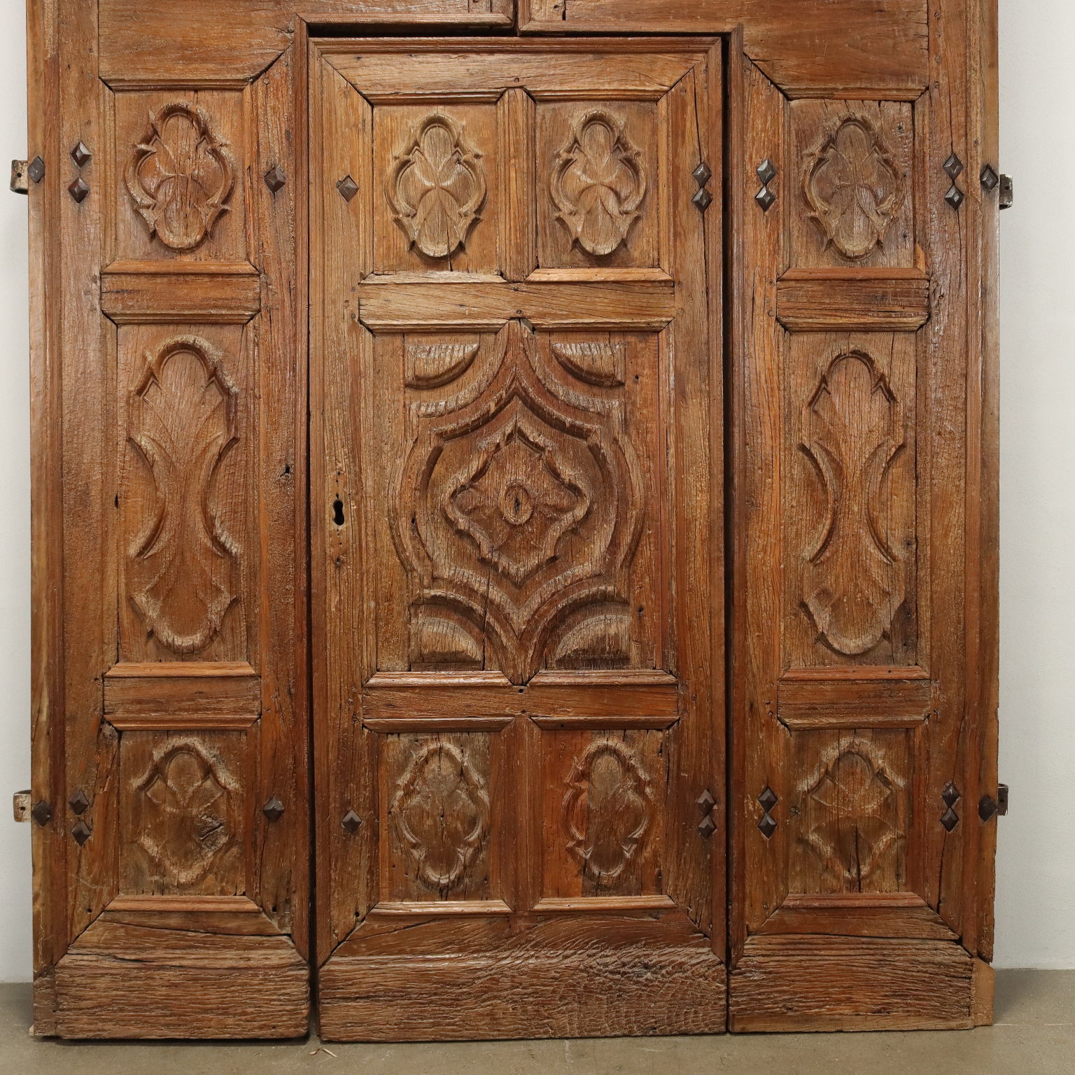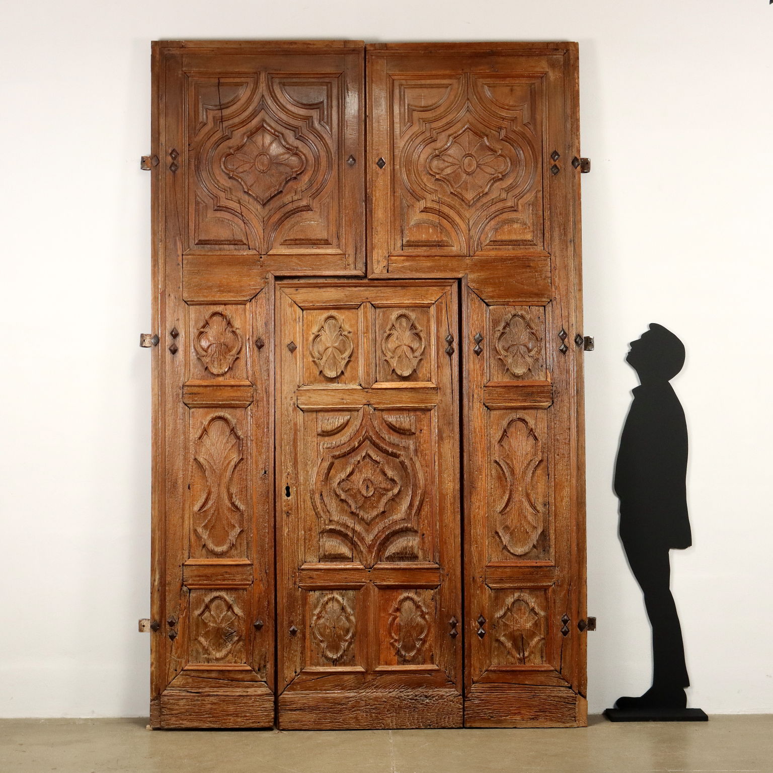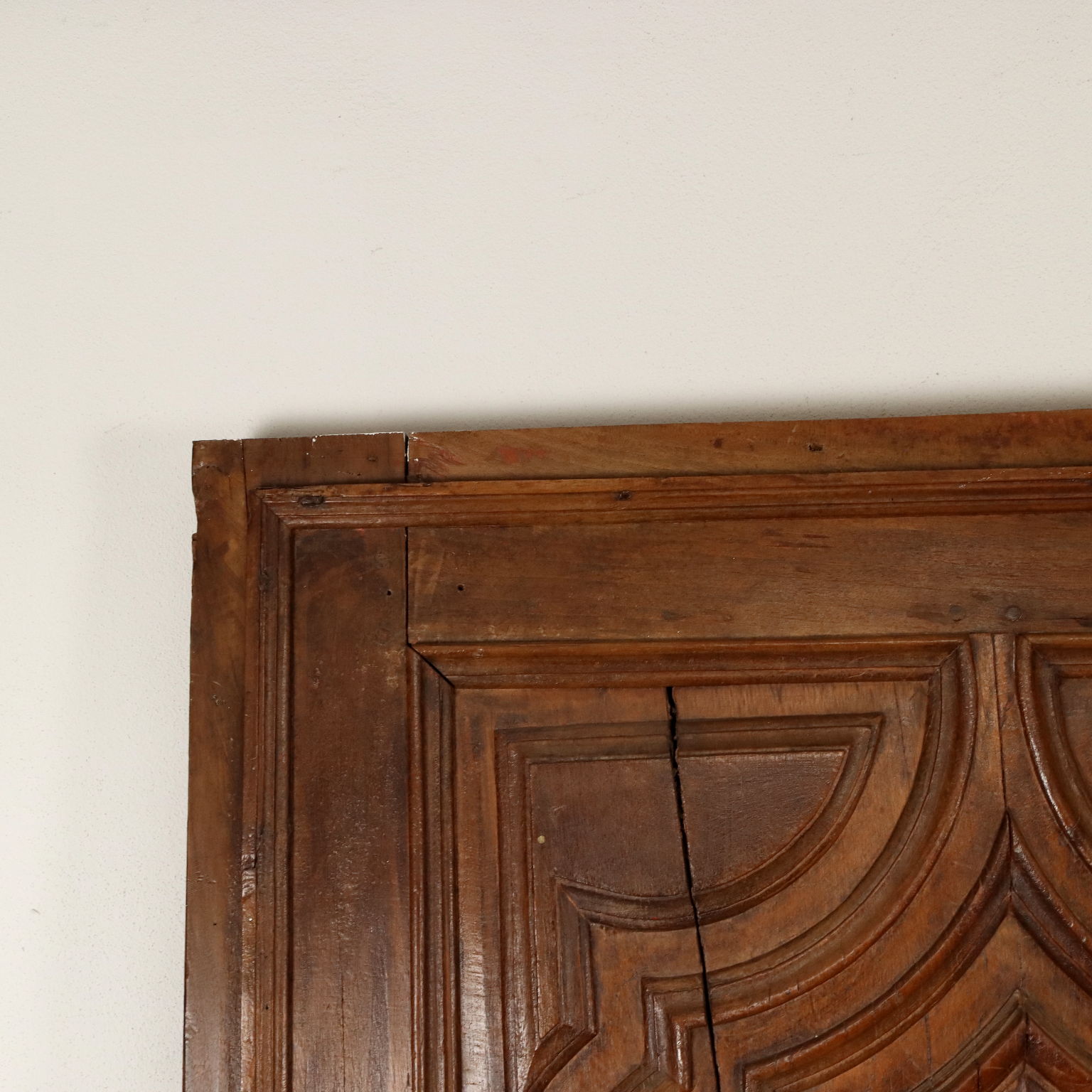 Grande portale in noce, intagliato con caratteristiche formelle a ragnatela.
