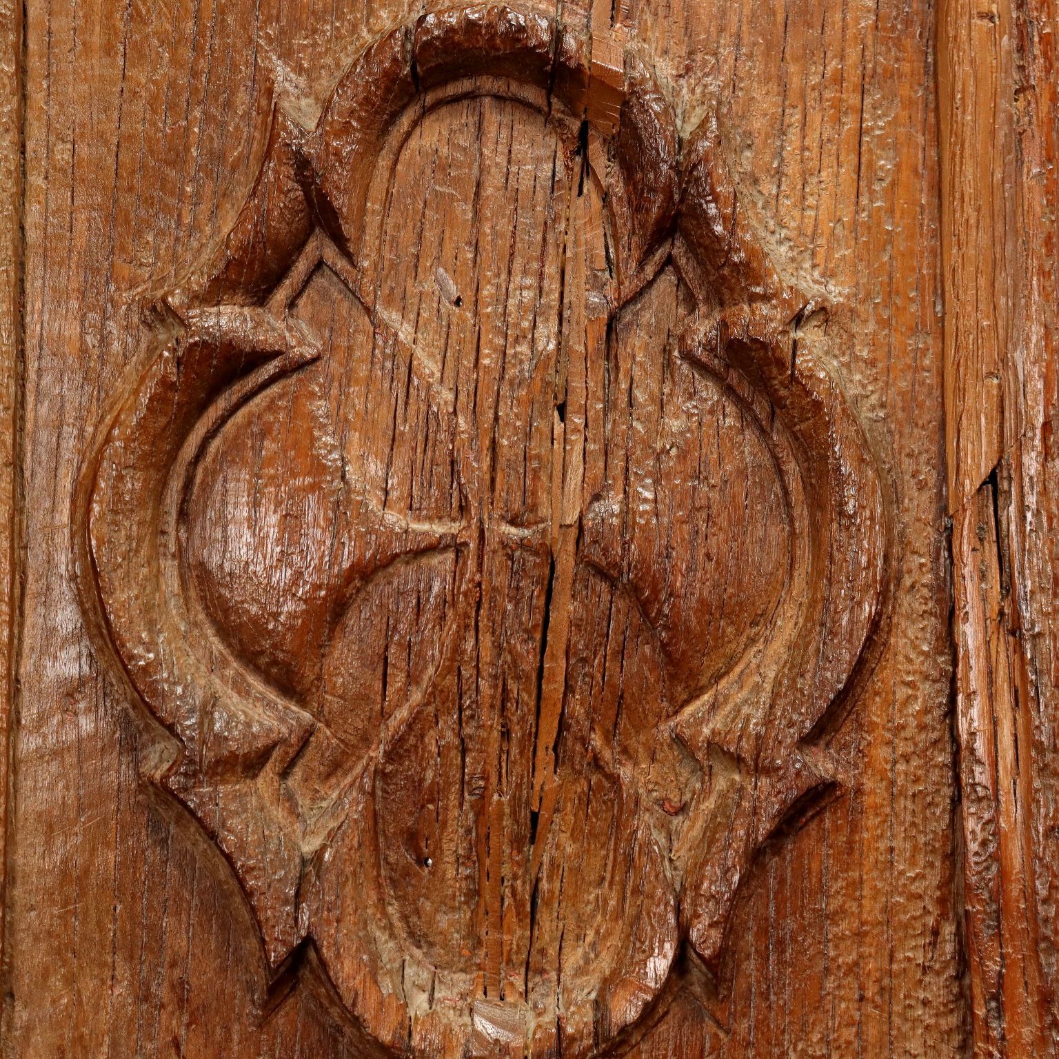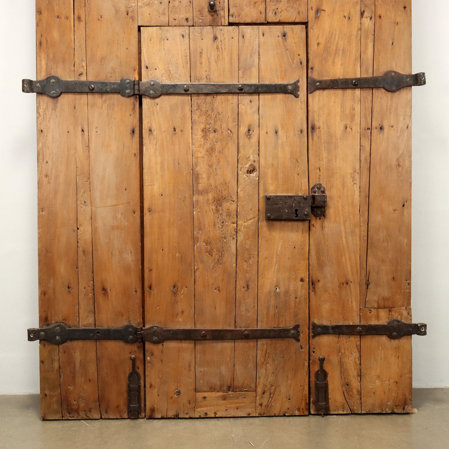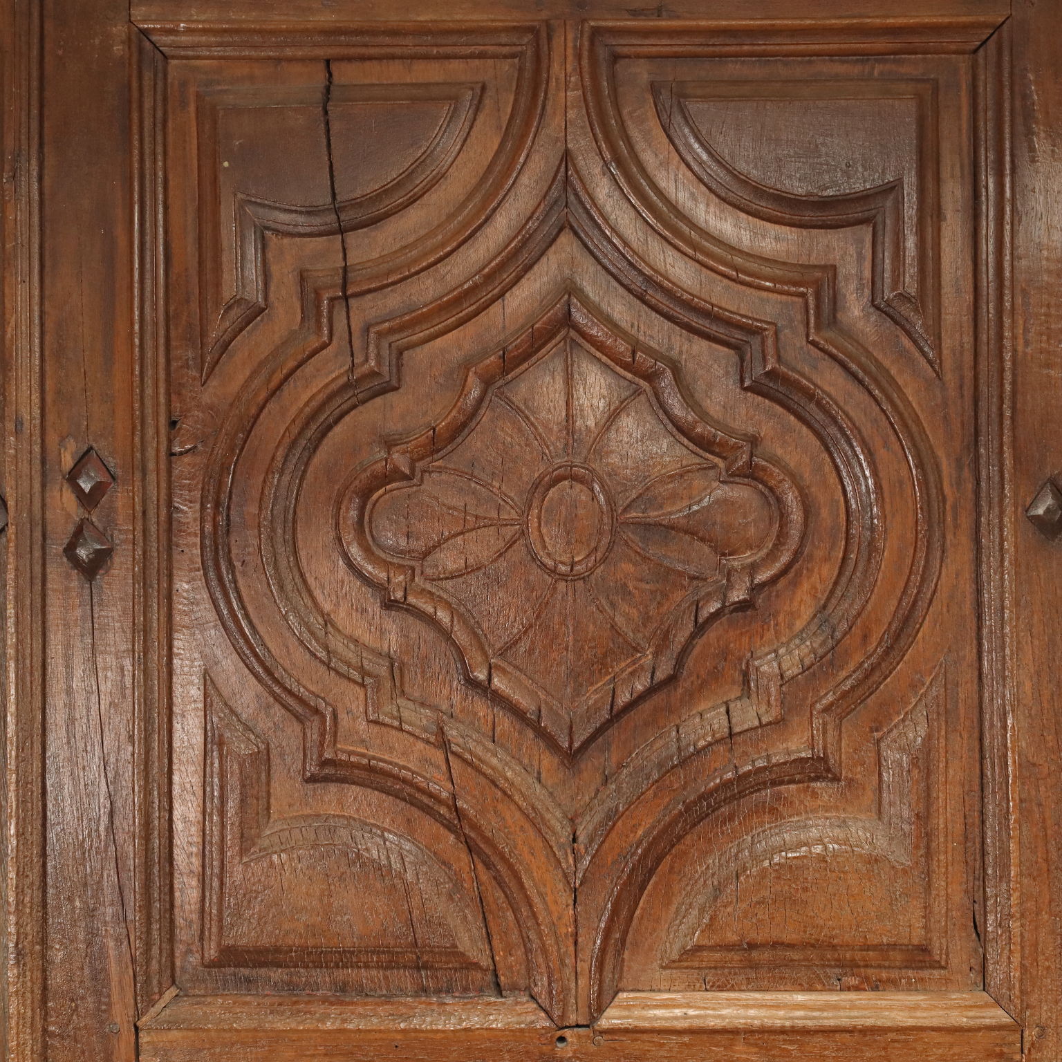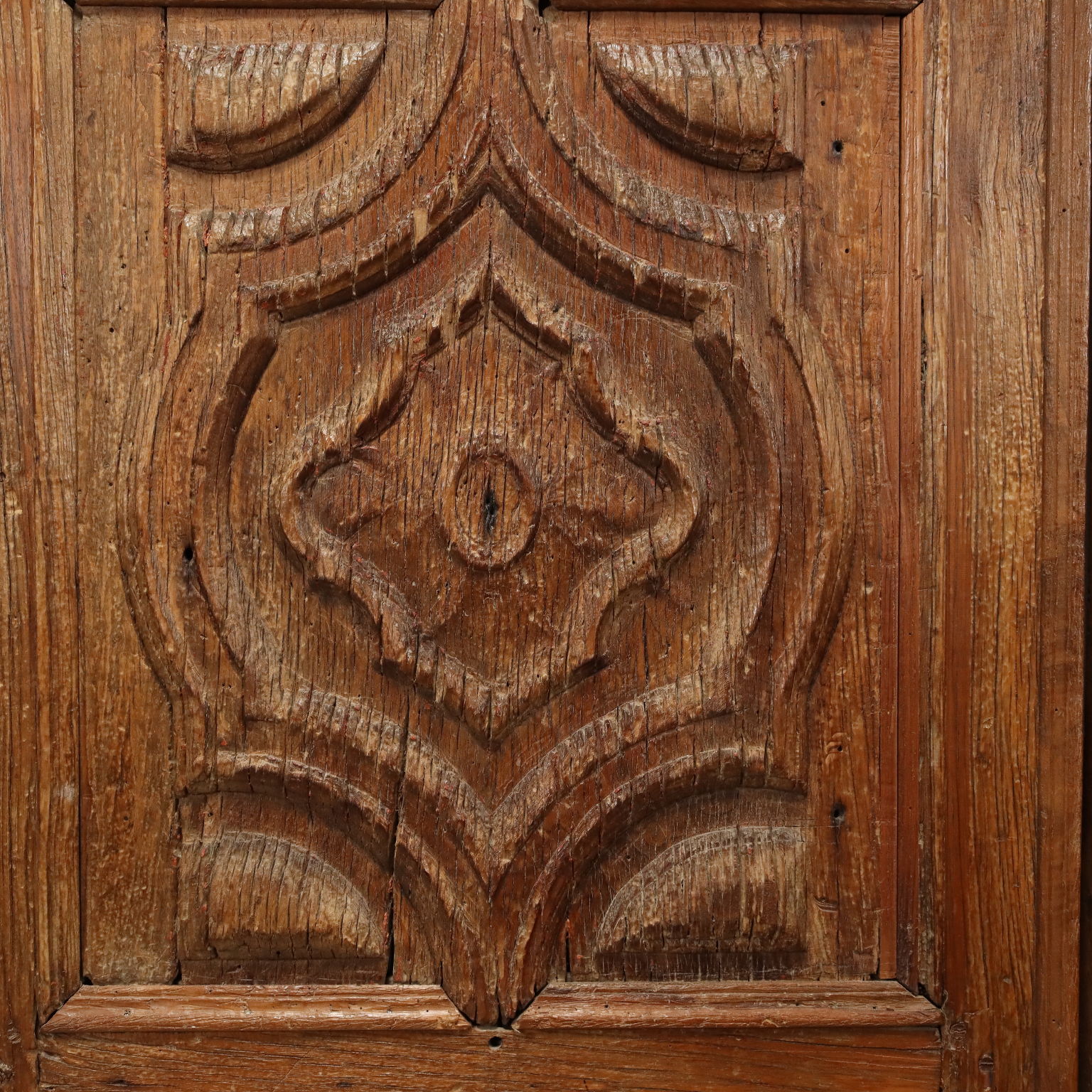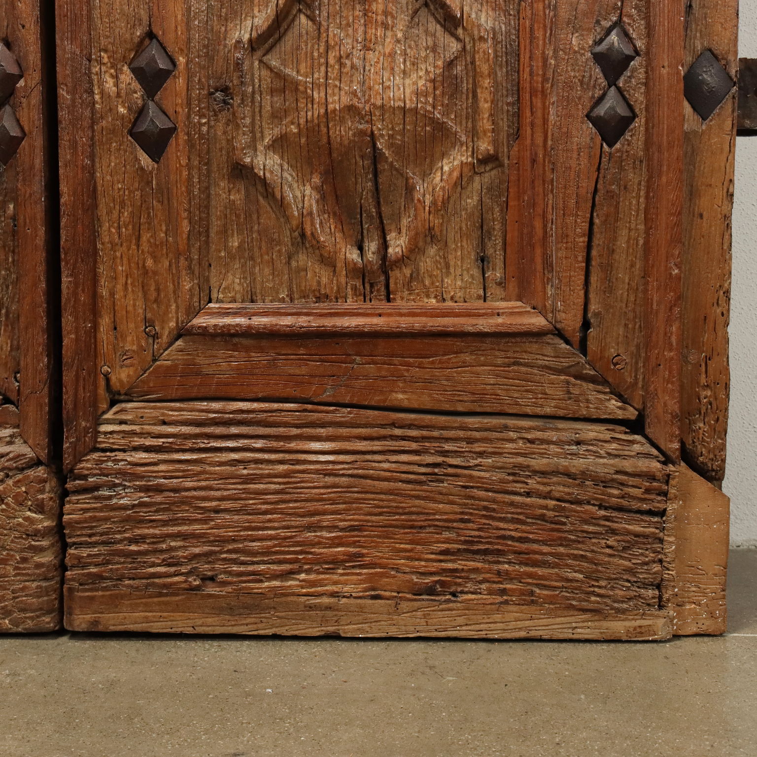 Grande portale in noce, intagliato con caratteristiche formelle a ragnatela.