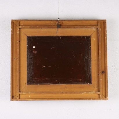 Olio su tavola. Firmato in basso a destra. Bruto Mazzolani, ferrarese figlio di artista, si dedicò alla pittura di paesaggio, ai ritratti e ai nudi. Le sue opere, sempre caratterizzate da forte realismo e minuzia di particolari, negli anni assunsero una sempre maggiore connotazione materica, e videro il passaggio, soprattutto nei paesaggi, ad uniformi campiture di colore spatolato direttamente sulla tela. Anche questo quadretto è realizzato con spatolate di colore, con consistenze materiche diverse che contribuiscono agli effetti di luci e ombre. L'opera è presentata in cornice.