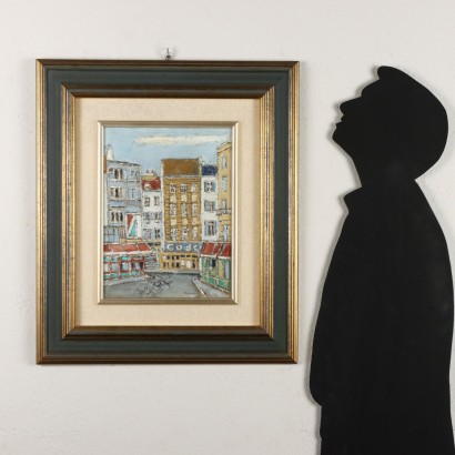 Olio su tela. Firmato in basso a destra. Orfeo Tamburi è stato un poliedrico e prolifico artista italiano. Disegnatore, pittore e giornalista, si è cimentato persino nella recitazione (L'invidia di Roberto Rossellini). Nel suo percorso pittorico Tamburi ha indagato le possibilità espressive della materia e tentato di superare l'antitesi figurativo-non figurativo. Il figurativo, presente nella sua prima produzione, viene a poco a poco abbandonato in favore di una geometrizzazione della realtà, un appiattimento delle forme che non preclude però un notevole potere espressivo. Ricorrenti nella sua produzione sono gli scorci cittadini, spesso parigini ma non solo, caratterizzati appunto dalla linee precise delle forme delle case ma anche delle finestre (Tamburi è stato definito anche "pittore delle finestre"), che contribuiscono ad enfatizzare appunto la visione geometrico della realtà. L'opera è presentata in cornice.