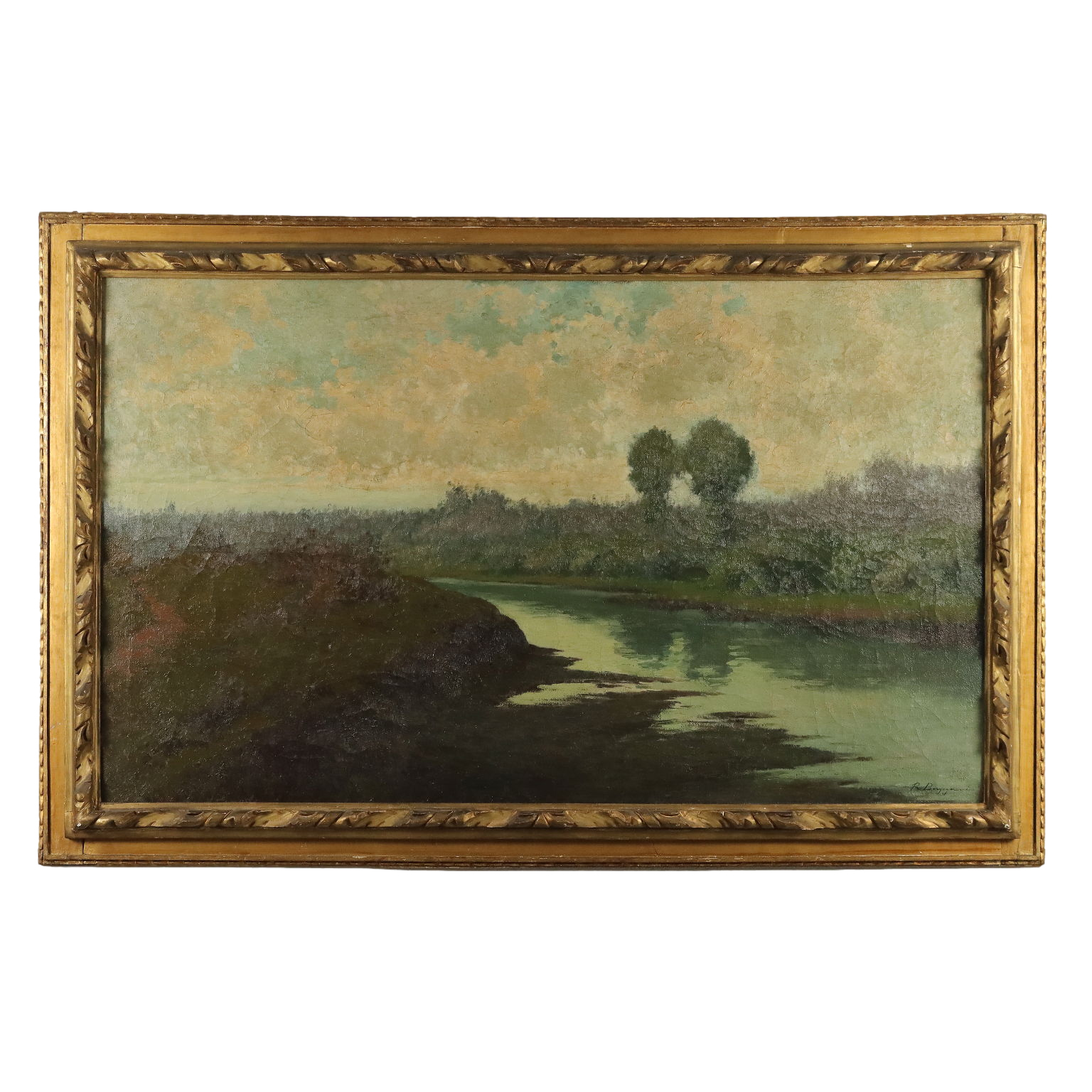 Olio su tela. Firmato in basso a destra. Specializzato nella pittura di paesaggio, il pittore Romeo Borgognoni raffigurò soprattutto scorci della campagna pavese, in uno stile che, pur con rigore verista, attinge all'impressionismo per le pennellate luminose e vibranti. In questo grande dipinto compare una campagna pianeggiante e verde traversata da un lento fiume, forse appunto uno scorcio del Ticino. L'opera è presentata in cornice coeva.