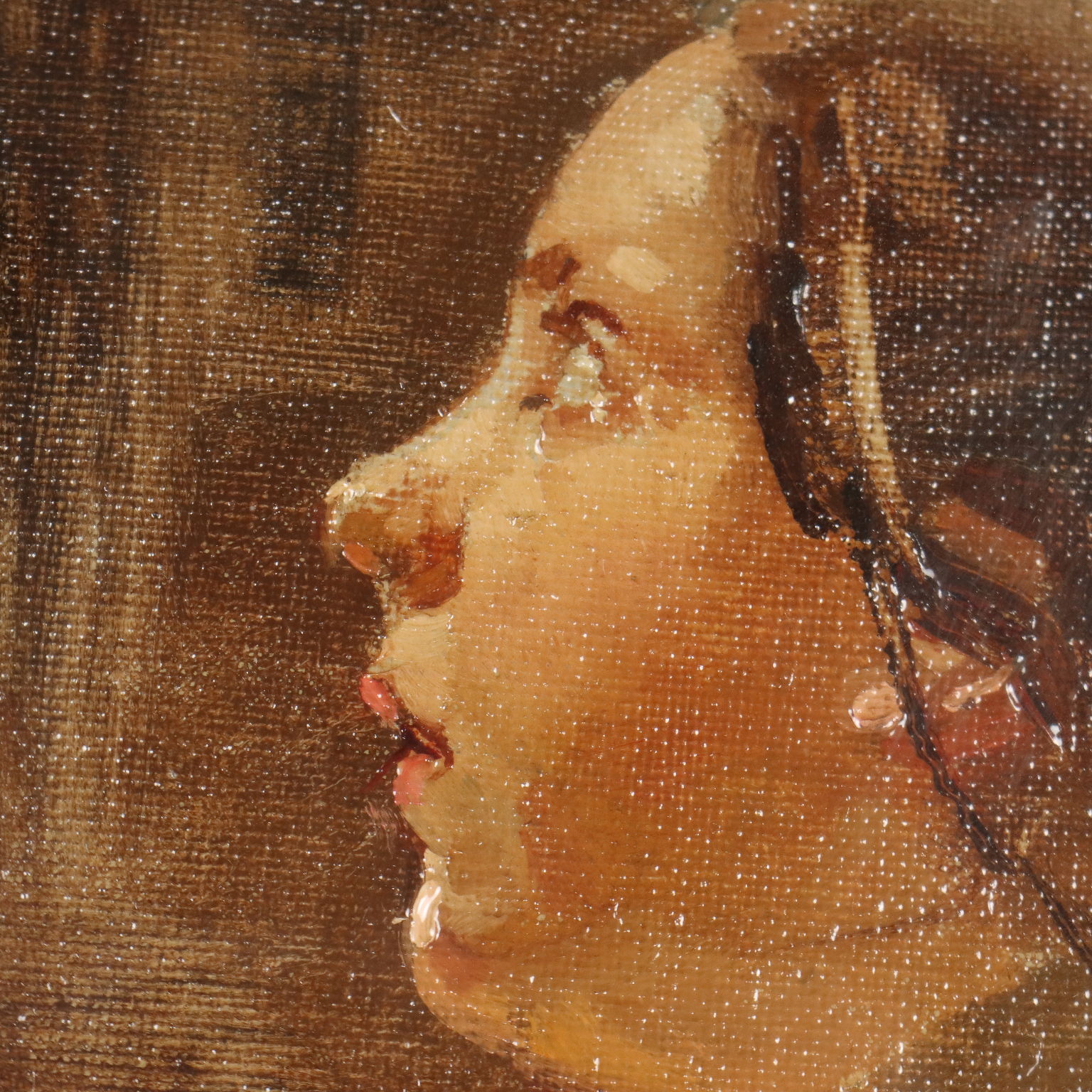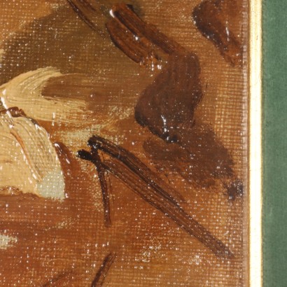 Olio su cartone telato. Al retro è presente dichiarazione di autenticità del figlio Mario Acerbi, anch'esso pittore, che definisce anche il titolo. Si tratta di uno studio per il dipinto della Madonna di Caravaggio , realizzato da Ezechiele Acerbi per la chiesa di Santa Maria in Betlem, chiesa parrocchiale di Borgo Ticino in Pavia. E' il borgo in cui l'artista visse, e al quale fu legatissimo, tanto che lo rese il soggetto preferito della sua produzione. Il figlio Mario dichiara inoltre che il volto utilizzato per dipingere la pastorella è quello della figlia stessa dell'artista. L'opera è presentata in cornice.