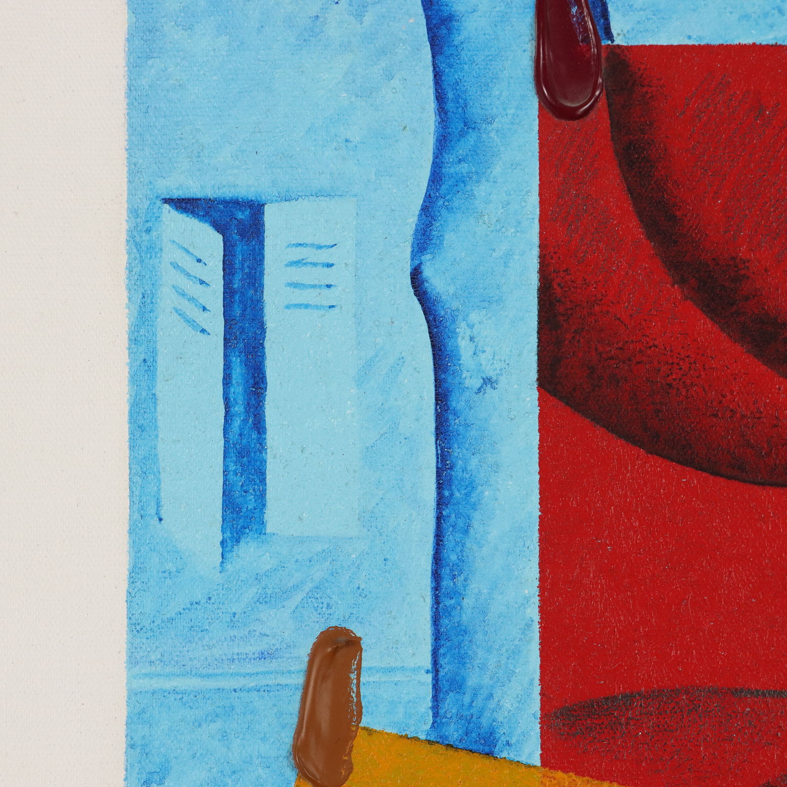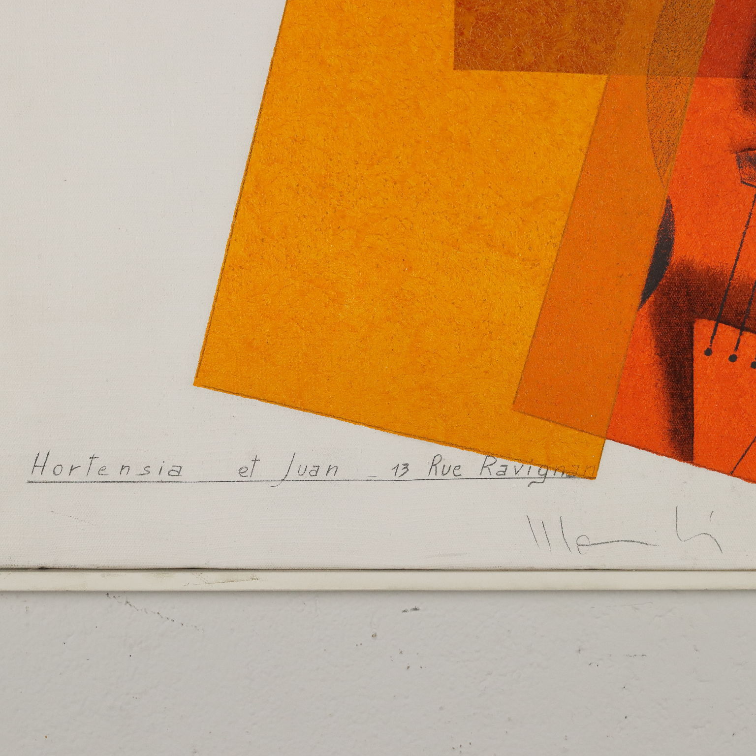 Acrilico su tela. In basso al centro la firma, a sinistra il titolo e un'ubicazione. Al retro presente cartiglio della Galleria d'arte contemporanea Chiari di Brescia. L'opera appartiene alla serie di Aldo Mondino intitolata "Hortensia e Juan", dedicata alla storia d'amore tra Hortense Fiquet Cézanne (1850 -1922), modella francese che fu modella prediletta e moglie di Paul Cèzanne, e Juan Gris (1887 -1927) il pittore e scenografo spagnolo esponente del cubismo. Opera in cornice.