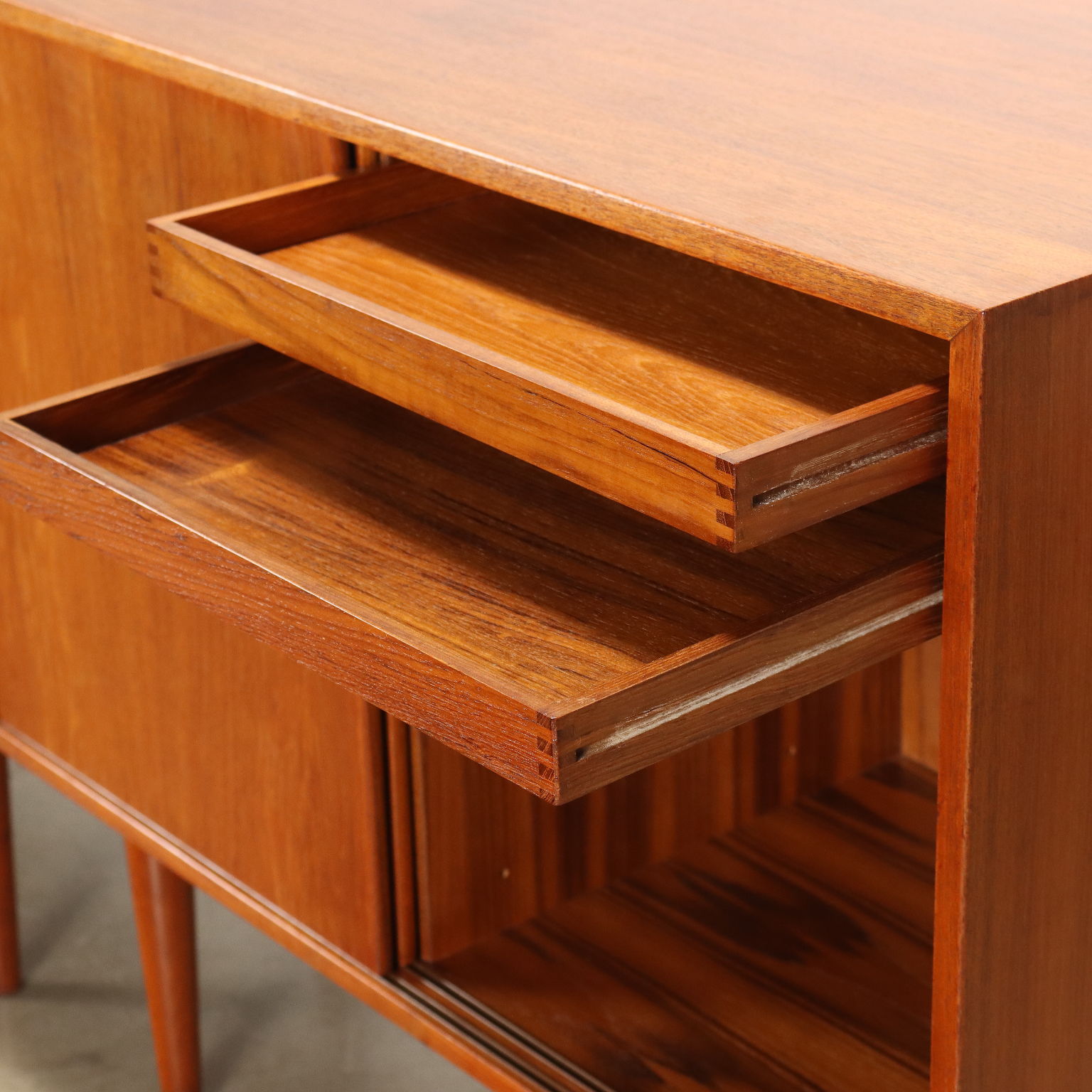 Sideboard composto da 3 elementi fruibili anche separatamente, ante scorrevoli e ante a serranda, legno impiallacciato teak. Un arredo per personalizzare con originalità un ambiente Living, la produzione Danese riporta alle forme e linee del mobile del Nord Europa, uno stile sobrio ma molto curato nei particolari. Accuratamente restaurato dal nostro laboratorio, la parte lignea ritorna così alla luminosità originale dell'essenza del legno di teak.