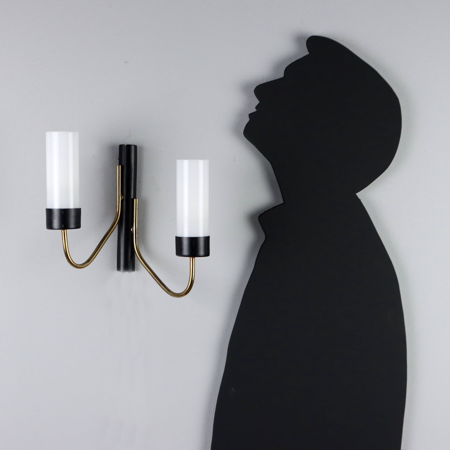 Lampada vintage da parete di manifattura italiana con struttura in metallo verniciato nero, elementi in ottone coppia di punti luce con paralume in vetro.