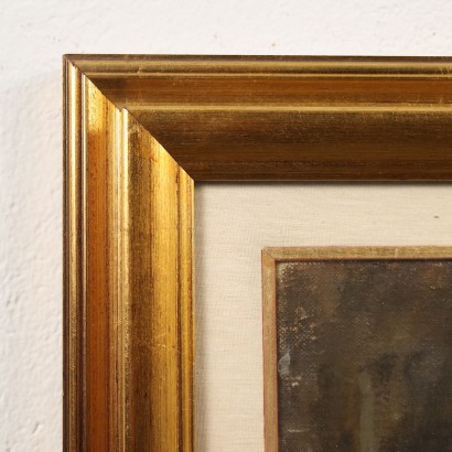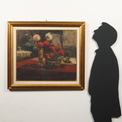 Olio su tela. Firmato in basso a sinistra. Achille Cattaneo, milanese di origine e di formazione, dedicò la sua produzione prevalentemente alle vedute prospettiche e agli scorci d'interni di chiese di Milano e dei Navigli milanesi e, in minor entità, di Venezia, interpretando in chiave impressionista la tradizione della "pittura urbana" ottocentesca lombarda. Qui propone invece una composizione di gerani su di un tavolo, affiancata da oggetti d'arredo: il rosso vivo dei fiori nel cestino spicca e centralizza lo sguardo rispetto agli altri elementi, resi in colori più tenui e sfumati. L'opera è presentata in cornice.