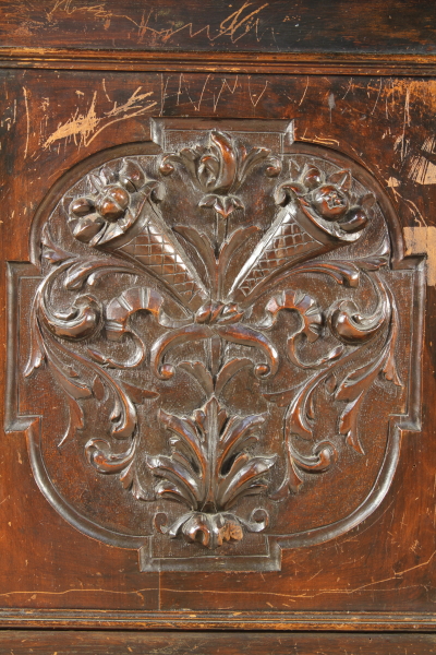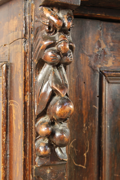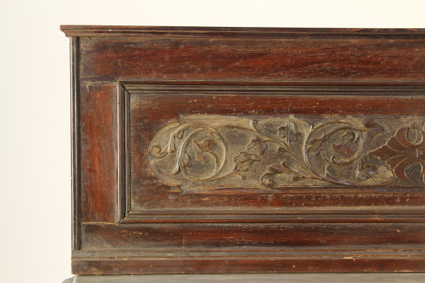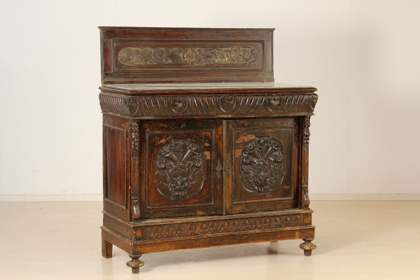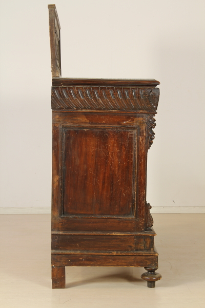 La credenza presenta due ante riccamente intagliate e cassetto. I montanti anch'essi intagliati terminano con piedi torniti. Piano in marmo bardiglio incassato. Alzatina intagliata.