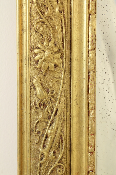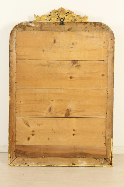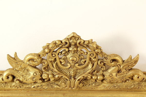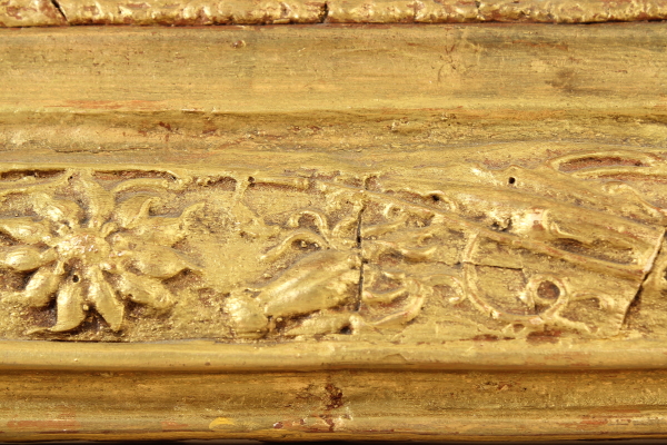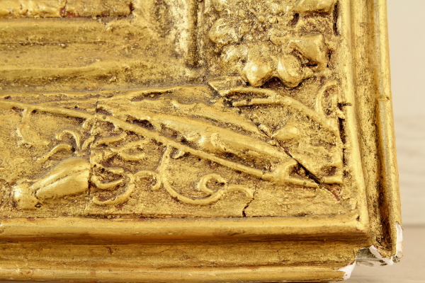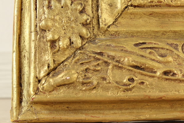 Cornice con intagli a pastiglia. Angeli superiori smussati e cimasa intagliate e traforate. Interamente dorata.