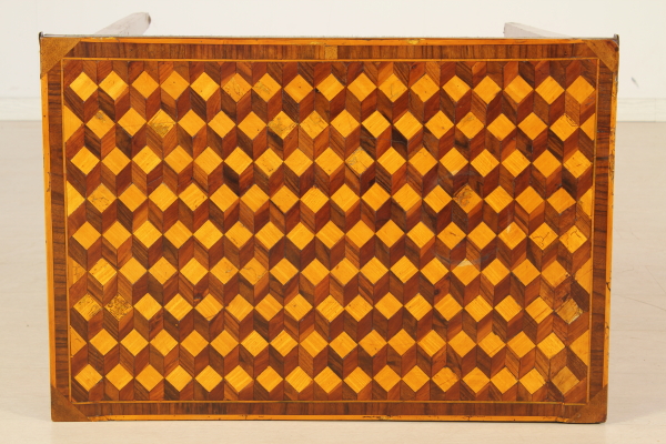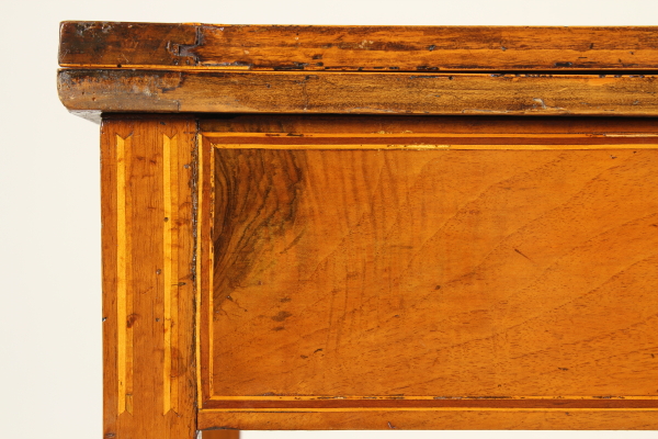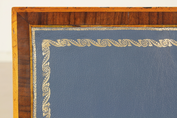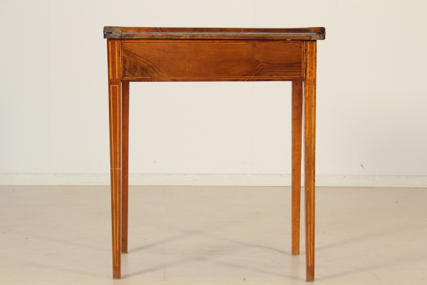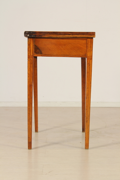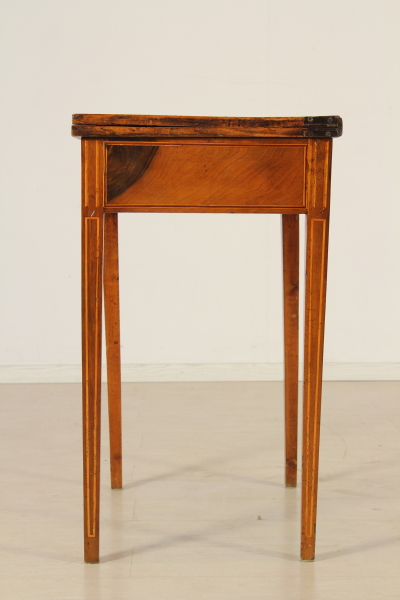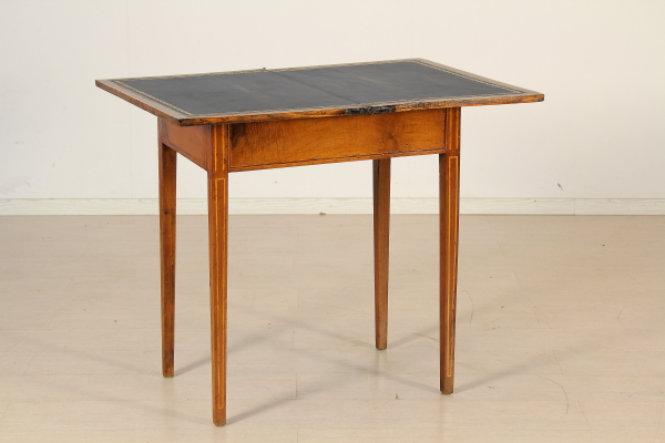 Tavolo retto da gambe tronco-piramidali, presenta piano apribile a libro con intarsio a marquette ed all'interno piano in pelle. Filettature in acero.