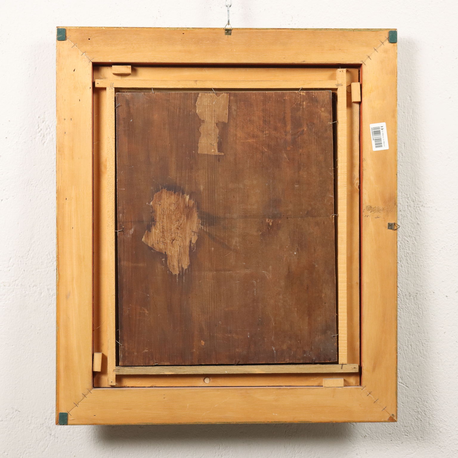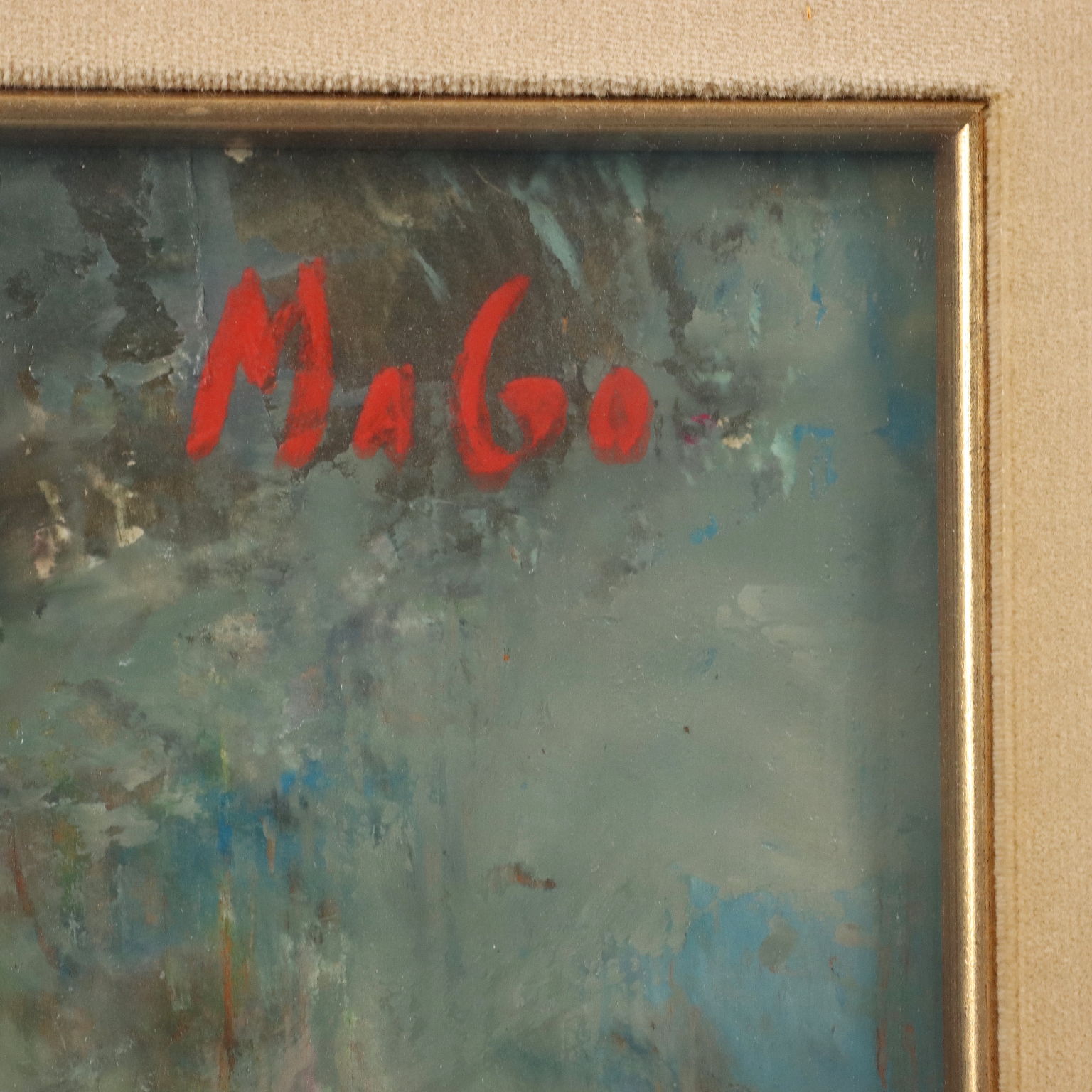 Olio su tavola. Firmato in alto a destra. Maurizio Goracci, in arte Mago, è un pittore romano di soggetti figurativi. L'opera raffigura una donna nuda avvolta in un drappo rosa, seduta su un cavallo che pascola: le figure di MaGo, seppur ben definite, son sempre collocate in uno sfondo surreale, sfumato in gamme di colori acidi, che conferisce un senso di fantastico. L'opera è presentata in cornice.