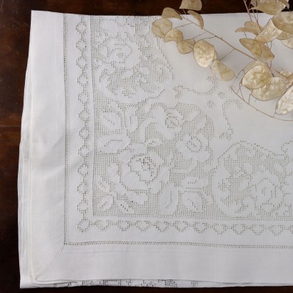 Tovaglia completa di dodici tovaglioli Elegante e raffinata tovaglia con ampio ricamo eseguito a mano in sfilato siciliano impreziosita da motivi floreali In alcuni punti sono presenti segni del tempo Colore bianco Forma rettangolare Composizione lino Colore bianco Dimensioni Tovaglia cm 300 x cm 178 Tovaglioli cm61 x cm 58