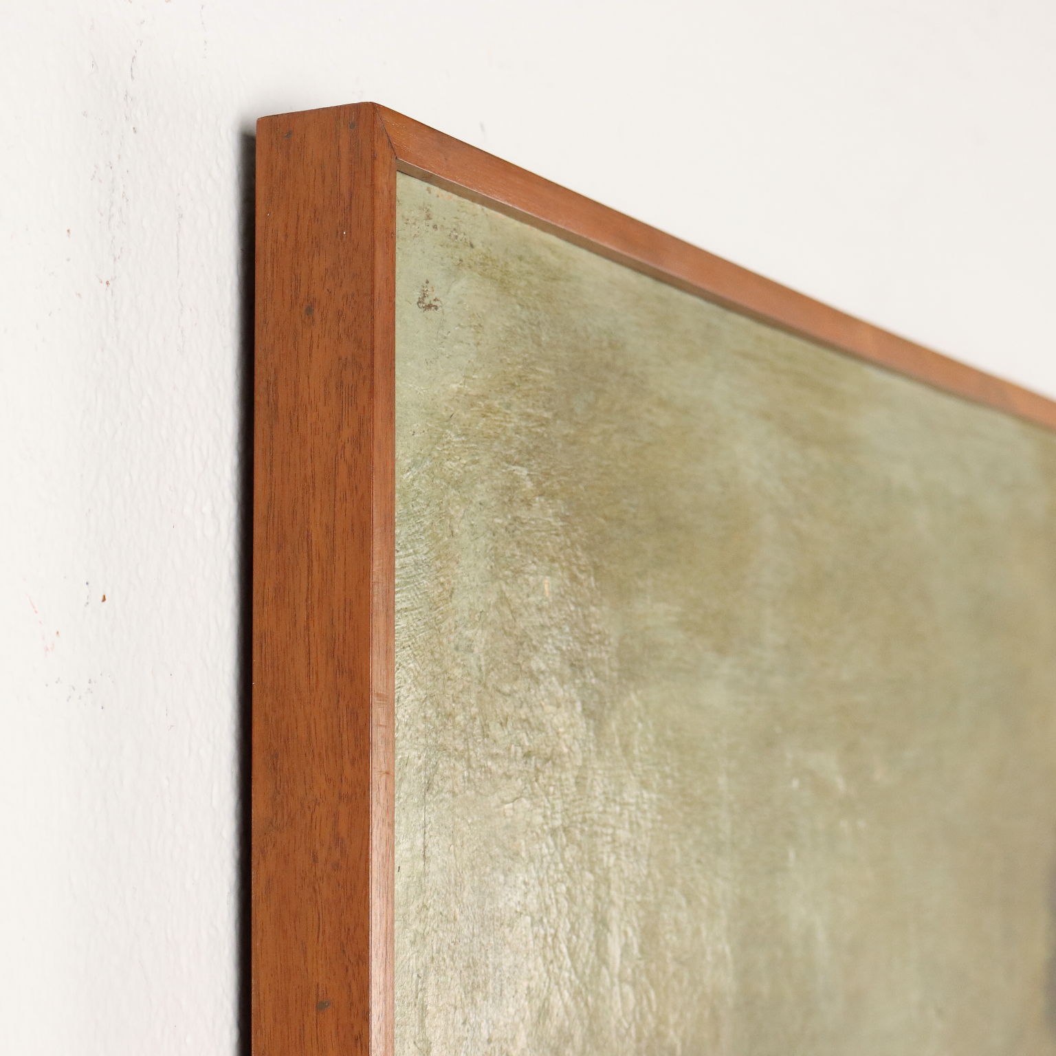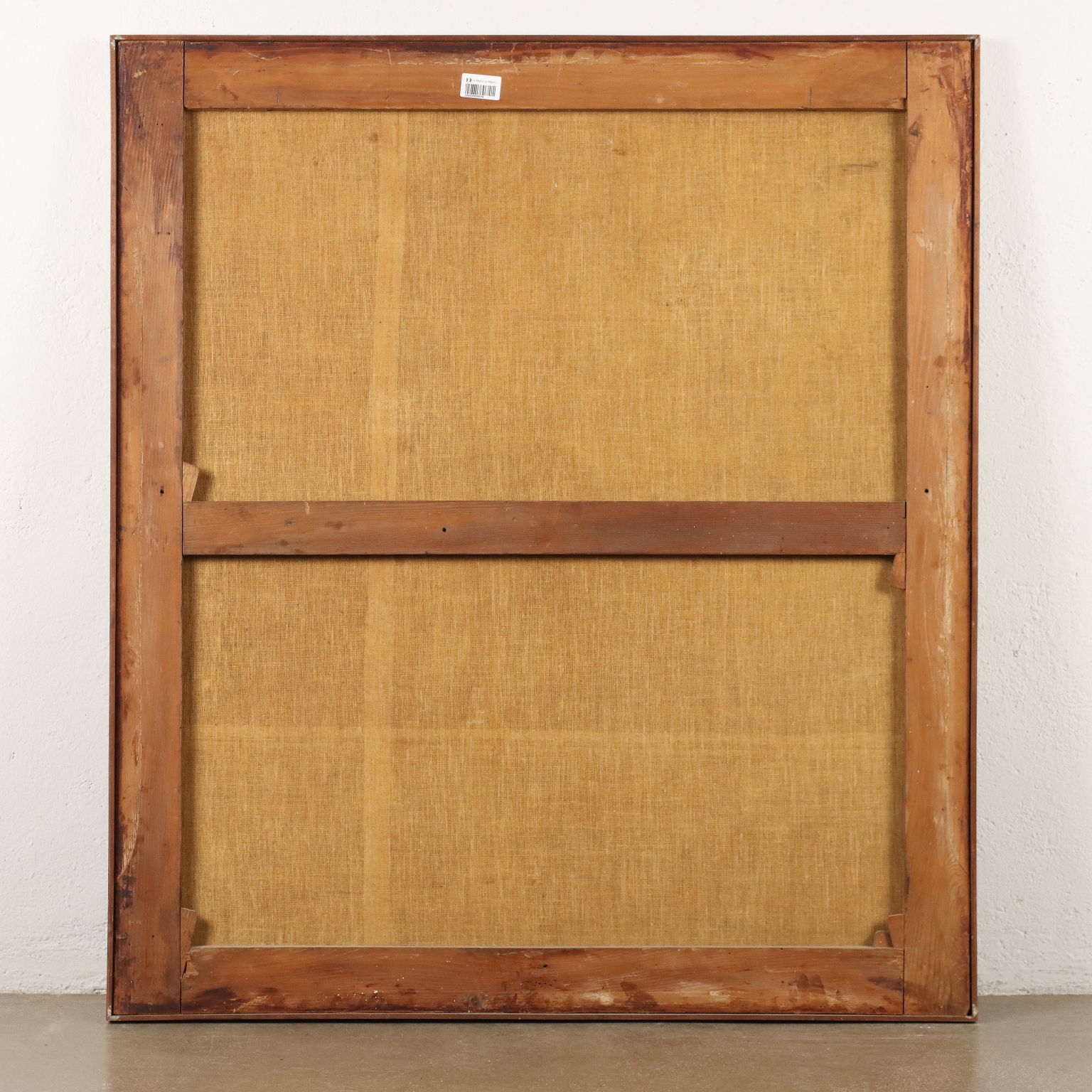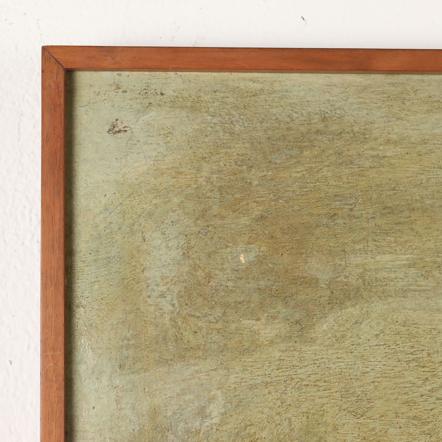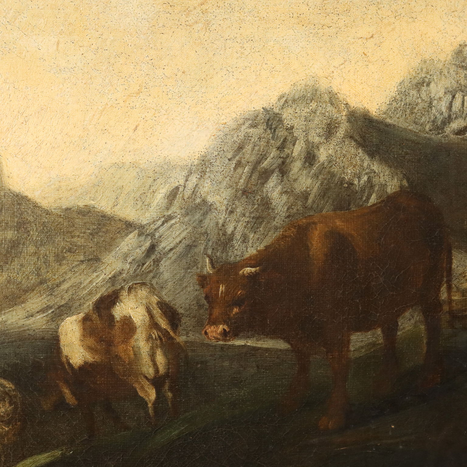 Olio su tela. Il paesaggio a sviluppo verticale vede al centro una imponente struttura architettonica in rovina, invasa dalle erbacce e presentata con colori e tratti sfumati, quasi a voler sottolineare la sua decadenza. Davanti, in primo piano e ben definite, alcune figure di pastori a riposo, mentre le vacche pascolano: un pastore suona lo zufolo, il secondo, seduto appoggiato al suo bastone, osserva il terzo, il quale denudatosi, è intento a lavarsi, allungato languidamente sulla riva della pozza d'acqua. A sinistra si apre lo scorcio di cime rocciose, grigie sotto un cielo dalle atmosfere albeggianti. La tipologia di composizione paesaggistica rimanda alla produzione di Antonio Travi, detto il Sordo di Sestri: l'artista che ancora ventenne fu allievo dello Strozzi, divenne poi, sotto l'influsso di Waals, pittore di paesaggi caratterizzati da toni plumbei, con zone chiare a contrasto, con edifici e rovine, e animate da figurette periferiche e quasi sperse nella profondità della scena. Il dipinto restaurato e ritelato, è presentato con cornice a listello.