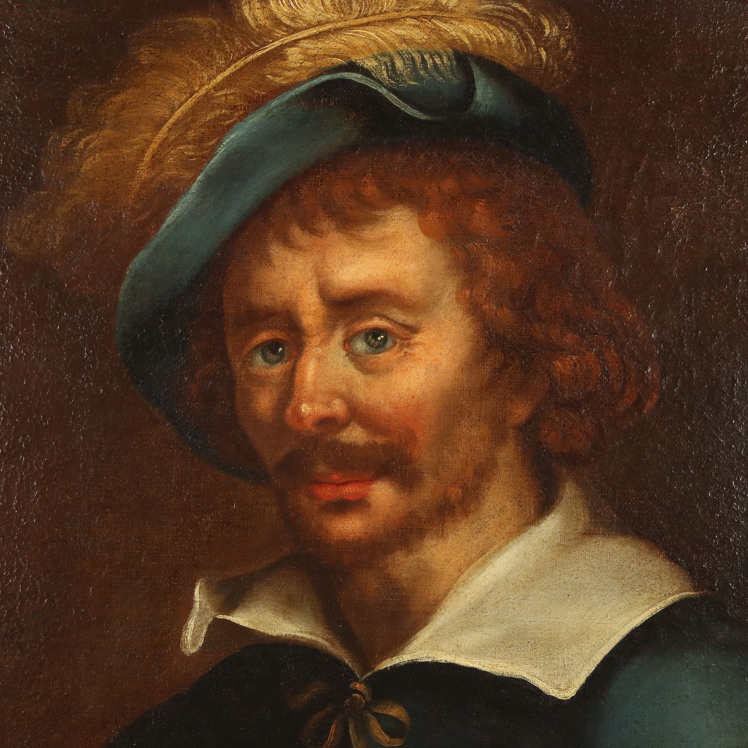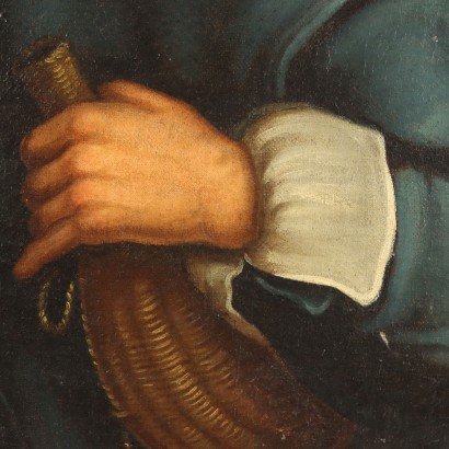 Olio su tela. Scuola nord-europea del XVII-XVIII secolo. Ritratto di un giovane signore che, spavaldamente tiene con le mani una bottiglia di vino e un calice appena riempito; lo sguardo già un po' lucido, il sorrisino un po' incerto, fan pensare che non sia la sua prima mescita! Il dipinto, restaurato e ritelato, è presentato in cornice in stile.