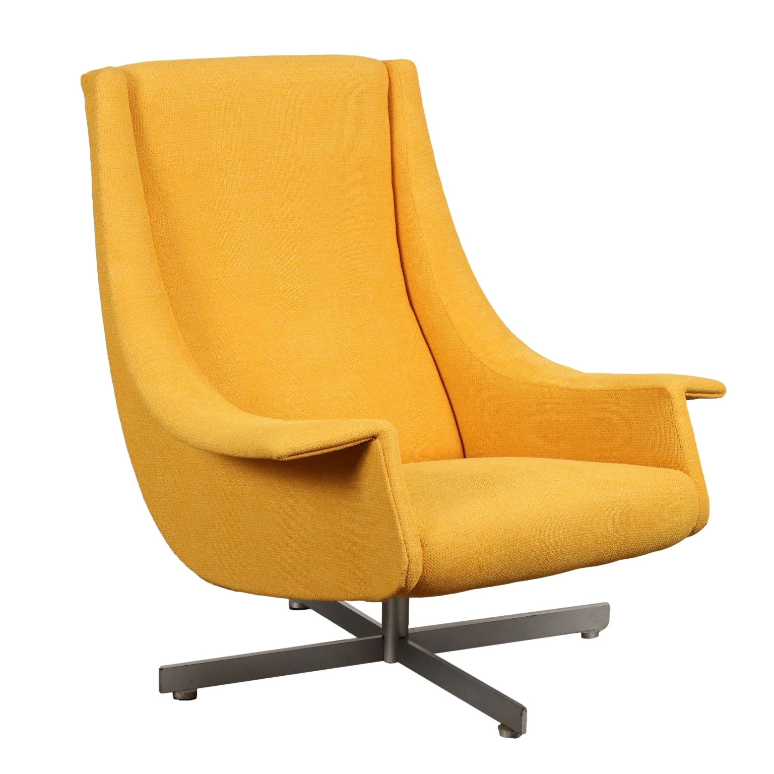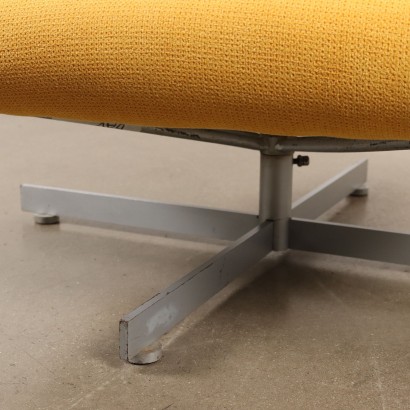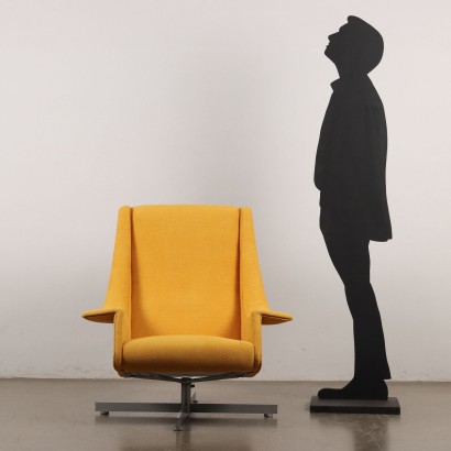 Poltrona girevole, imbottitura in espanso, rivestimento in tessuto, base in metallo. Restaurata. Una comoda poltrona dalla forma tipica degli anni 60 ideale per un'ambiente con una zona relax, con un tocco vintage. Accuratamente restaurata dal nostro laboratorio con intervento di sostituzione dell'imbottitura e del rivestimento, per dare nuova vita alle cose.
