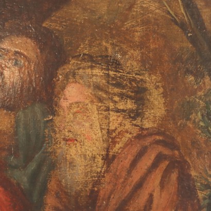Olio su tela. La scena racconta l'episodio biblico del Libro dell'Esodo, in cui Mosè prega il Signore di aiutare il popolo d'Israele che, in fuga dall'Egitto, si ritrova nel deserto del Sinai senza cibo e senza acqua: nel dipinto è ripreso il miracolo dell'acqua, che Mosè fa scaturire da una roccia, sotto lo sguardo di Dio e mentre il popolo assiste sorpreso e inneggiante. L'ambientazione della scena è in realtà in un paesaggio verdeggiante, qual era quello dell'artista, mentre le figure sono in abiti orientali. Il dipinto, restaurato e ritelato, è presentato in cornice in stile.