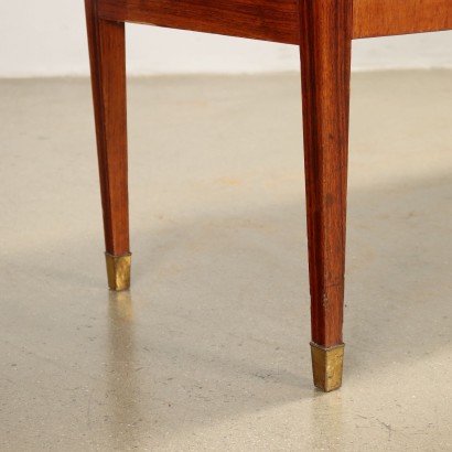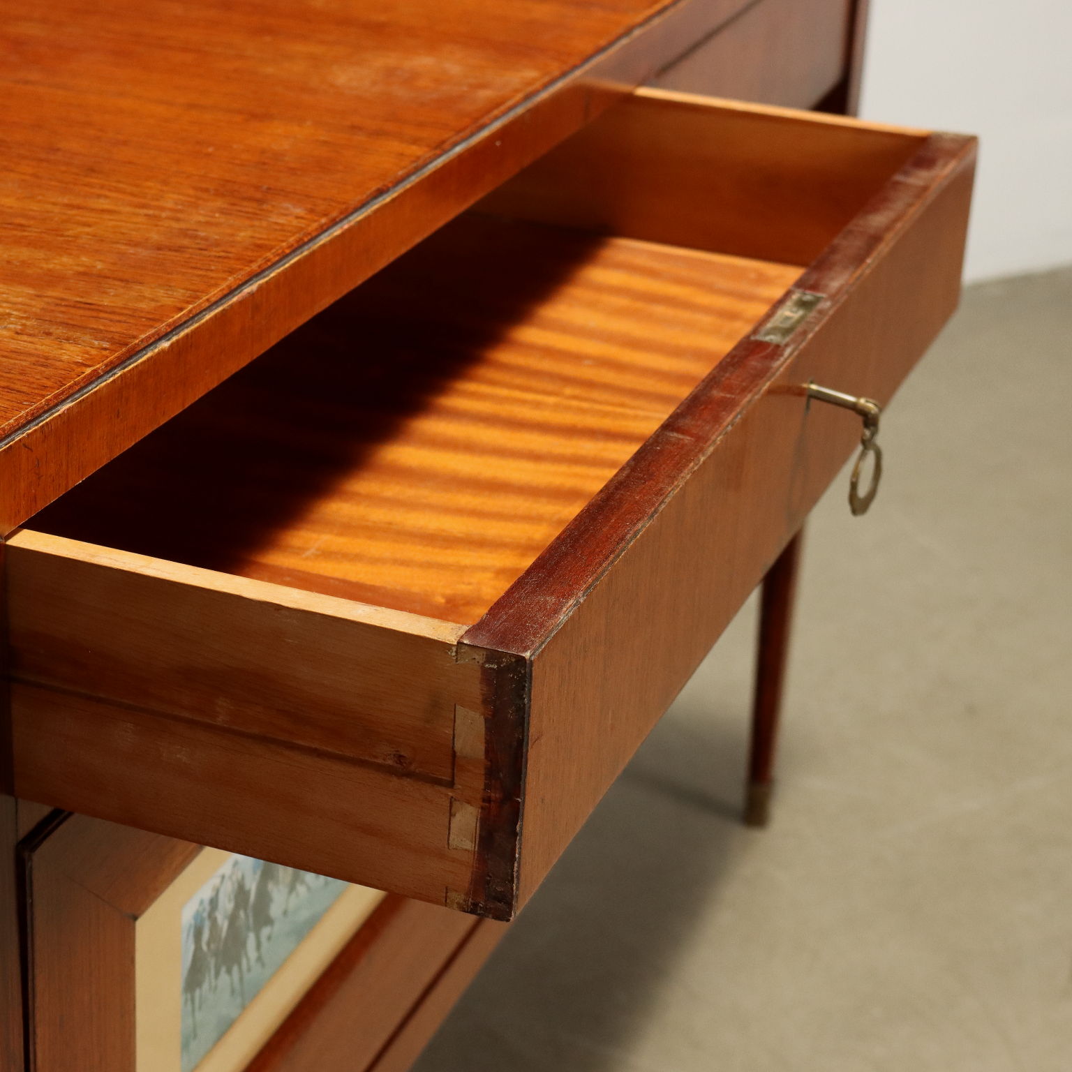 Elegante buffet, con cassetti a vista, vano contenitore con apertura a ribalta, disegno decorativo sull'anta. Legno impiallacciato legno esotico, puntali delle gambe in ottone.