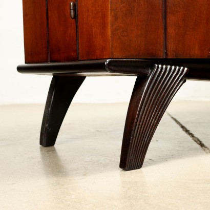 Elegante mobile bar con ante battenti con vani porta bicchieri e cassettini all'interno, vani a giorno e doppi contenitore con illuminazione e apertura a ribalta. In legno impiallacciato noce e in legno massello tinto ebano e presenta un vetro specchiato. Restaurato.