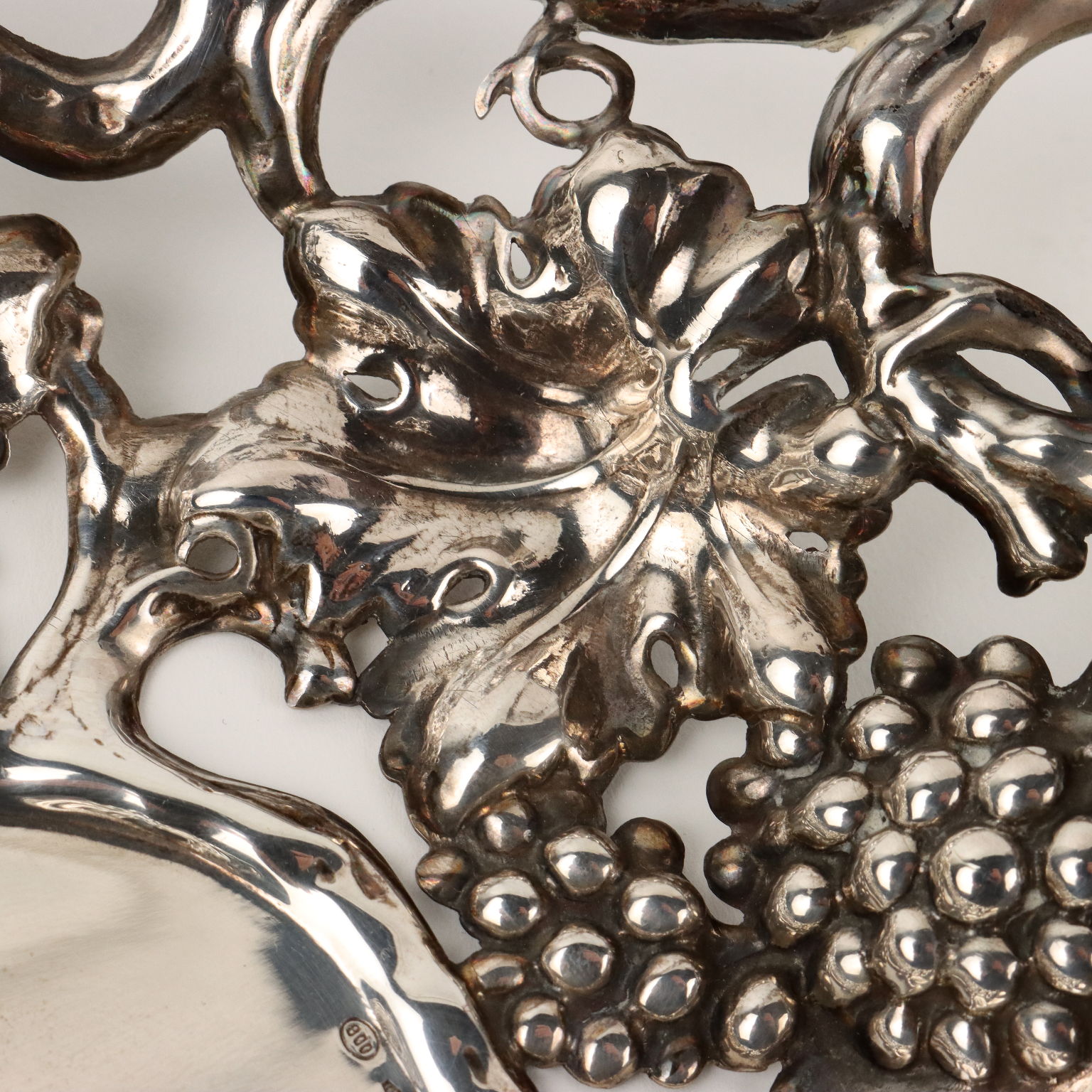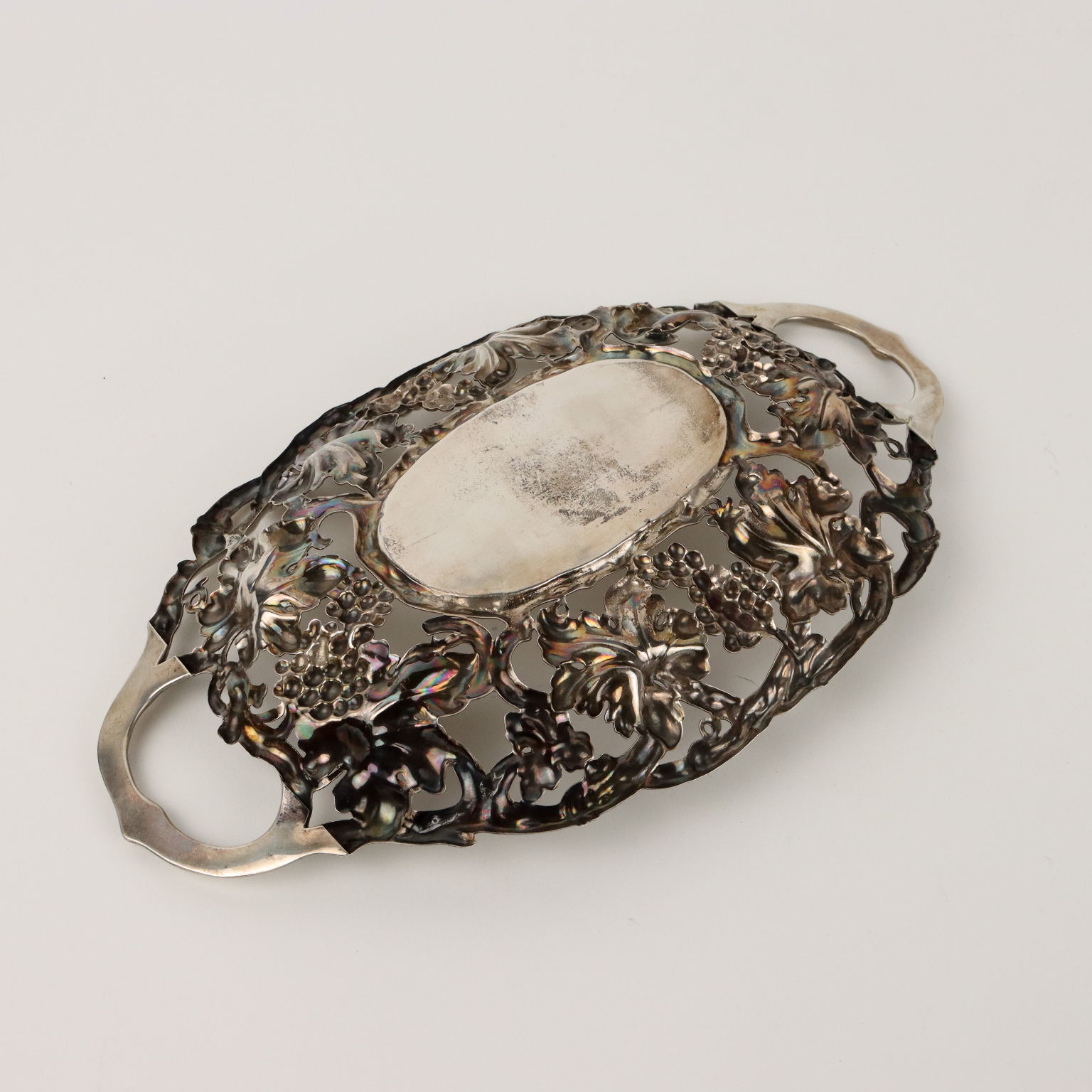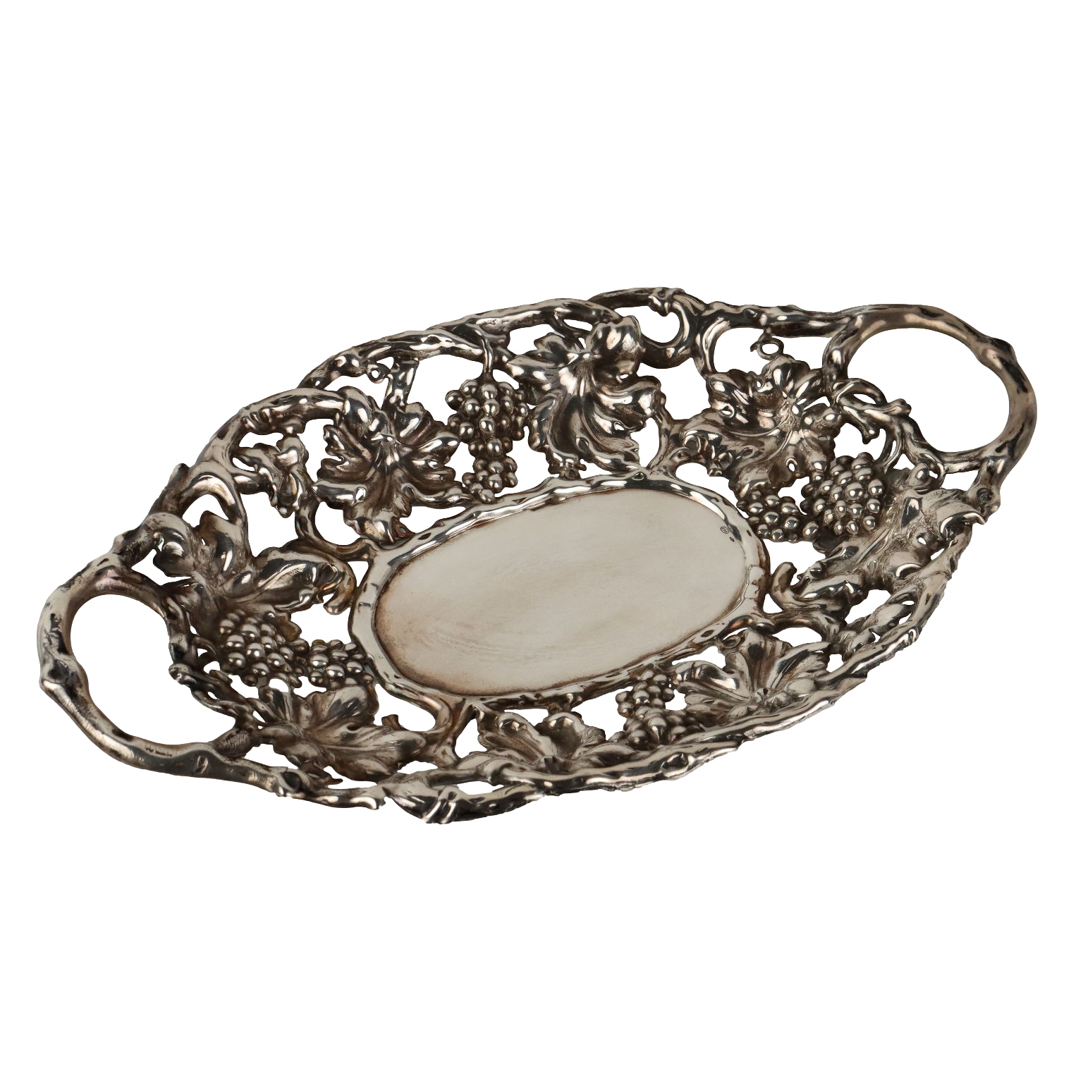 Cestino ovale a due manici in argento sbalzato e traforato a motivi vegetali di tralci d'uva e foglie. Marchi dell'argento incussi sul bordo del cavetto. Grammi 300.