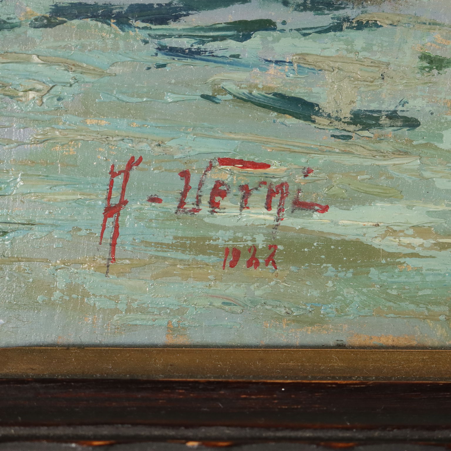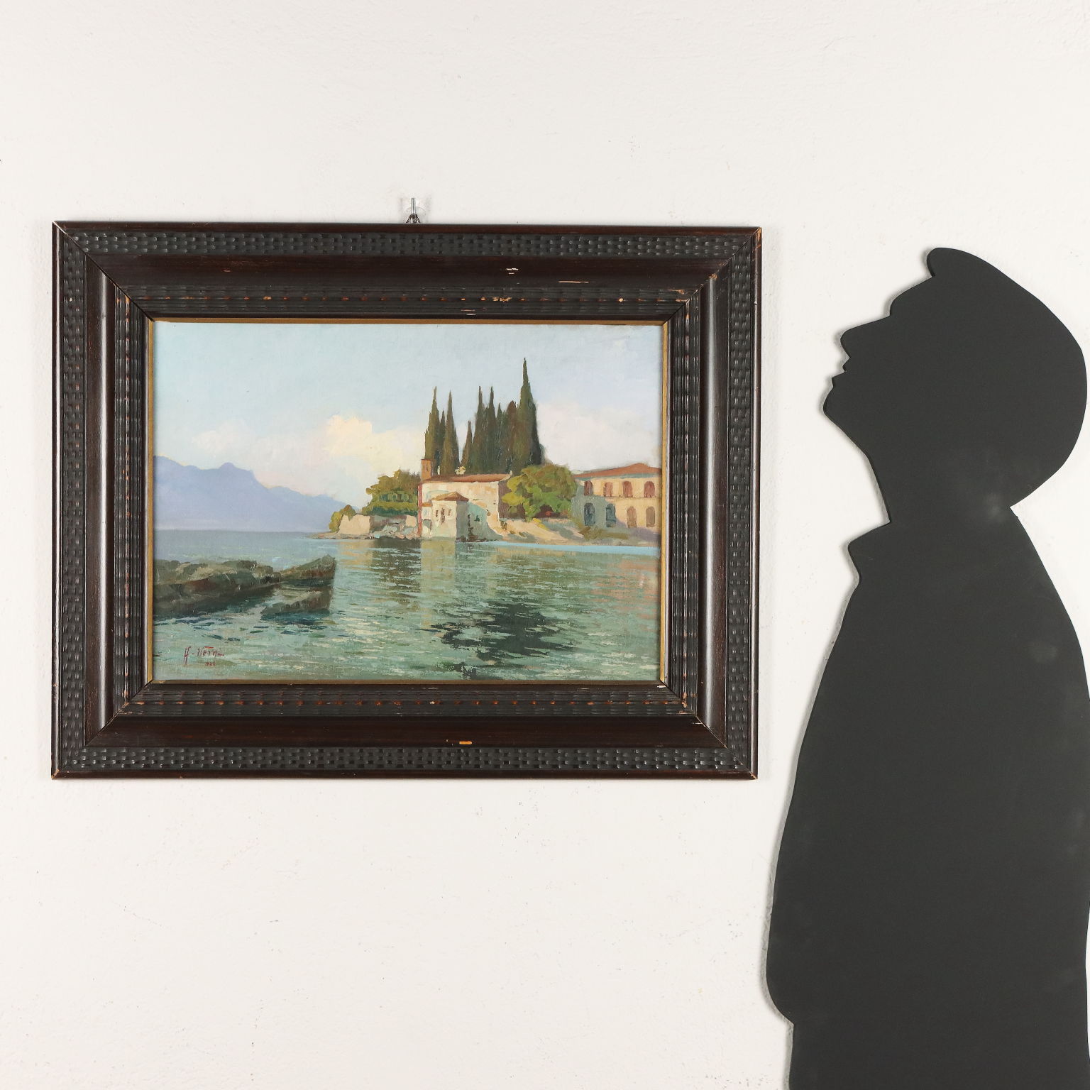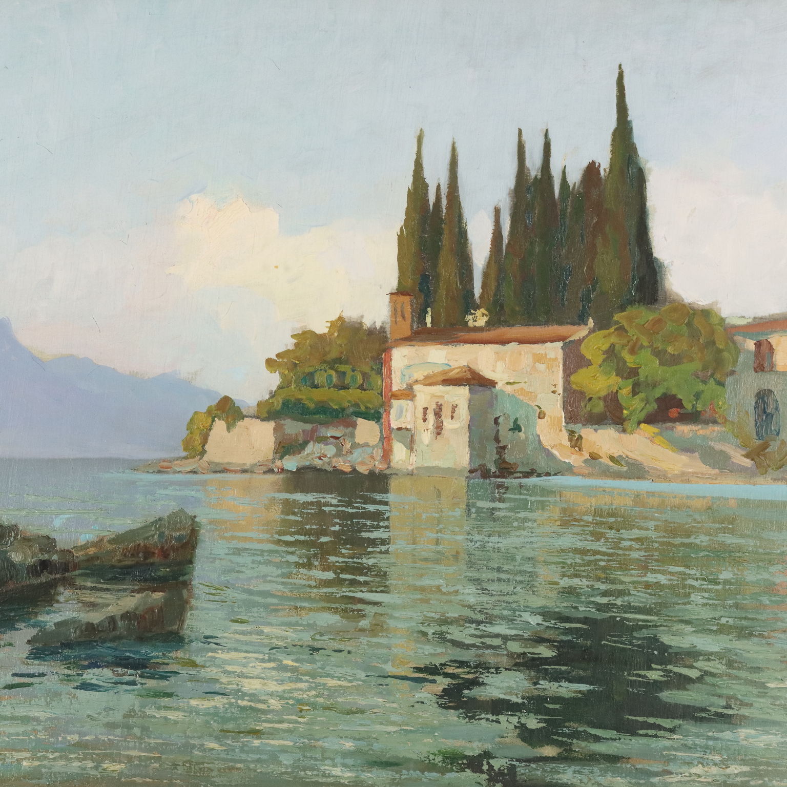 Olio su tavola. Firmato e datato in basso a sinistra. Arturo Verni, pittore bresciano, si dedicò prevalentemente al paesaggio, prediligendo in particolare il Lago di Garda, come in questo dipinto. I paesaggi di Arturo Verni sono realizzati sempre con una notevole tecnica impressionista. L'artista, infatti, usa una pennellata veloce, a tratteggio, per delineare velocemente le forme e i volumi. L'opera è presentata in cornice guilloché coeva.